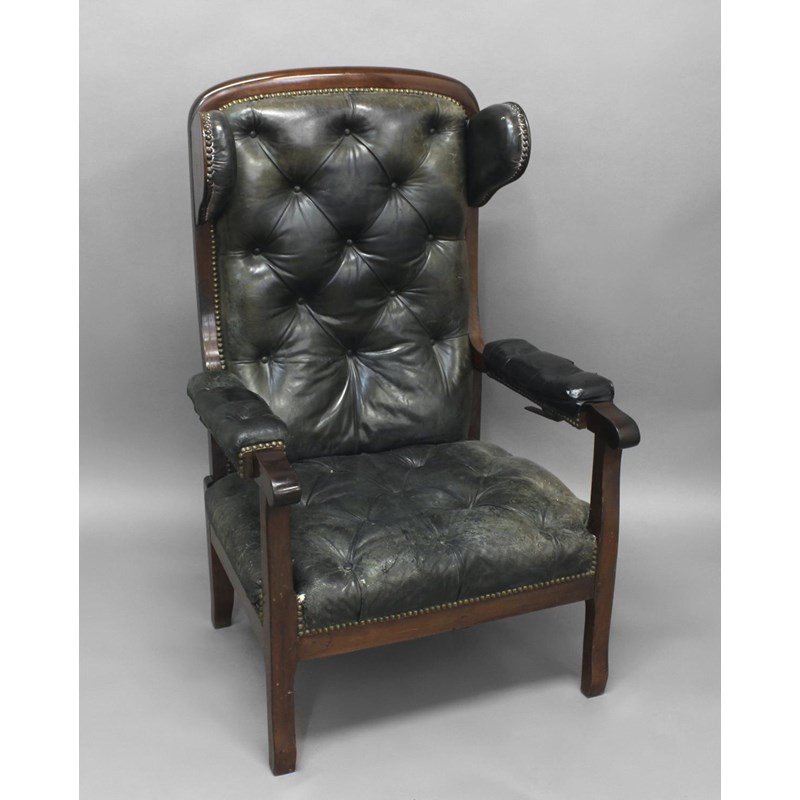 The mahogany frame with buttoned leather back, seat and arms with leavers to recline the back, with removable wings, with a label beneath the rear stretcher 'Du Pont Fauteuils Mechaniques, Paris' 120cm high, 72cm wide.
