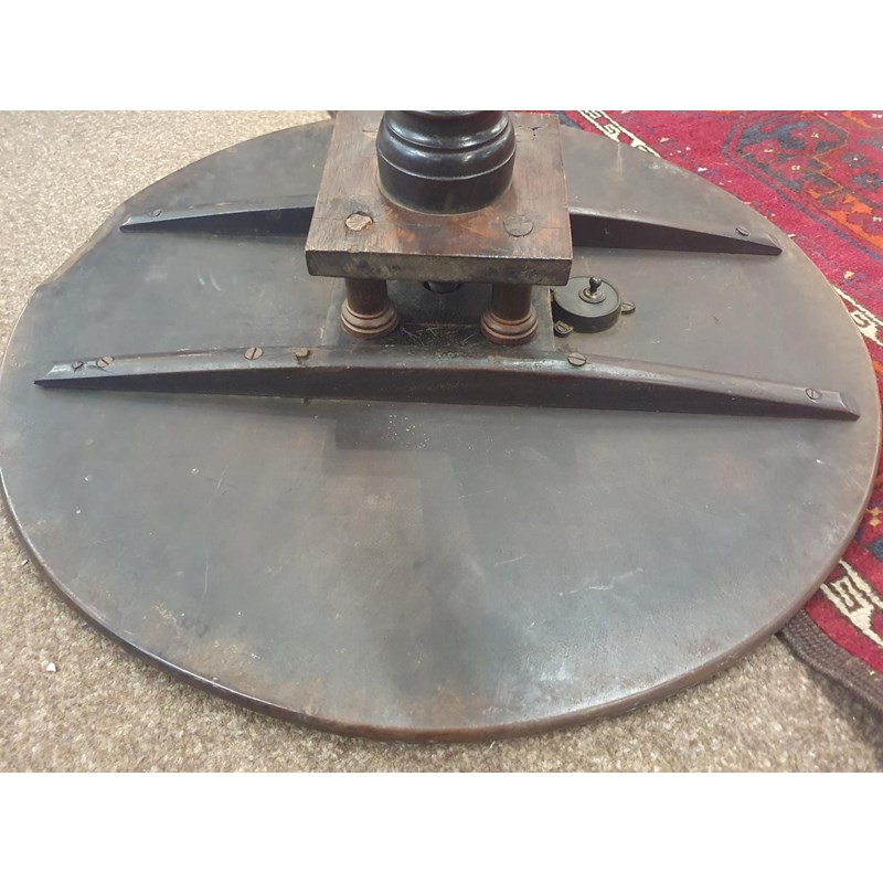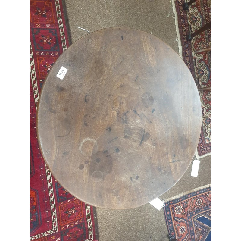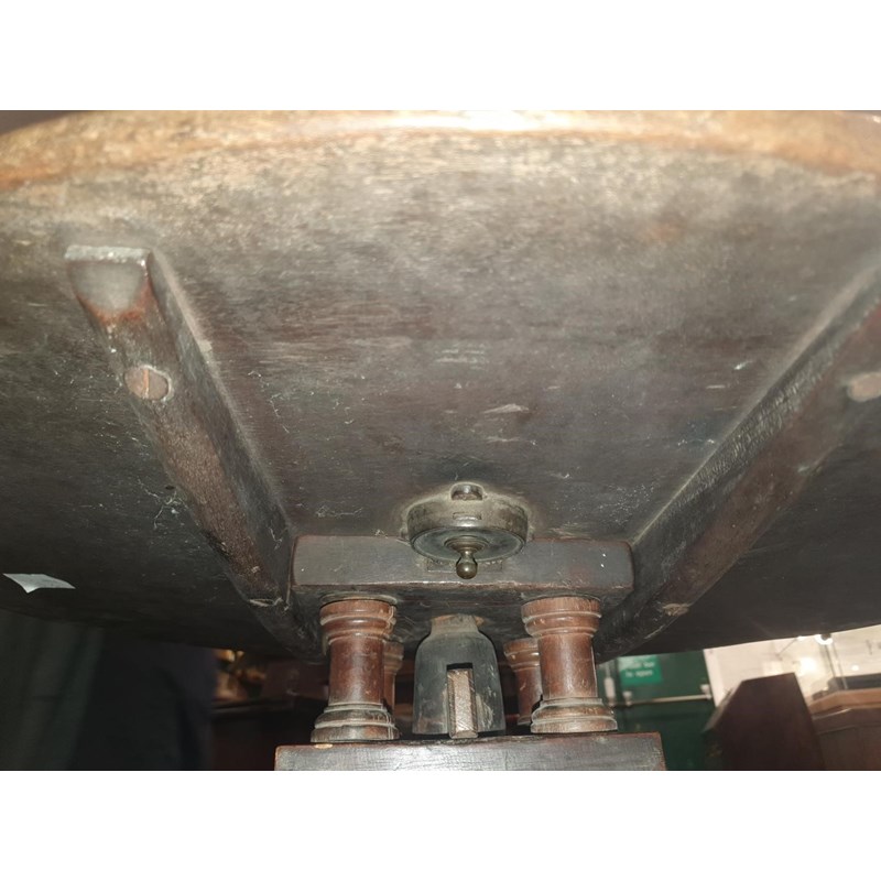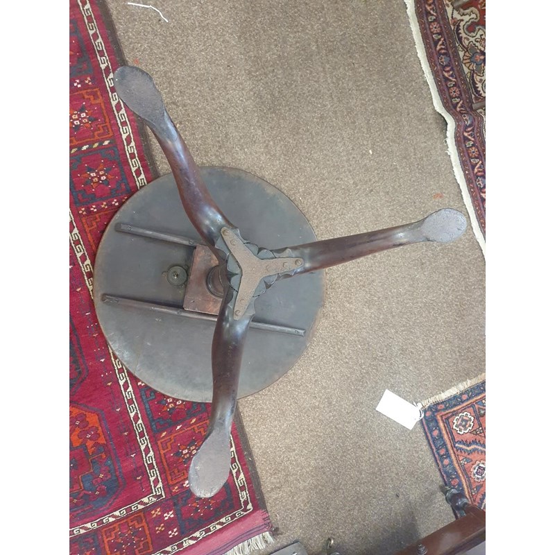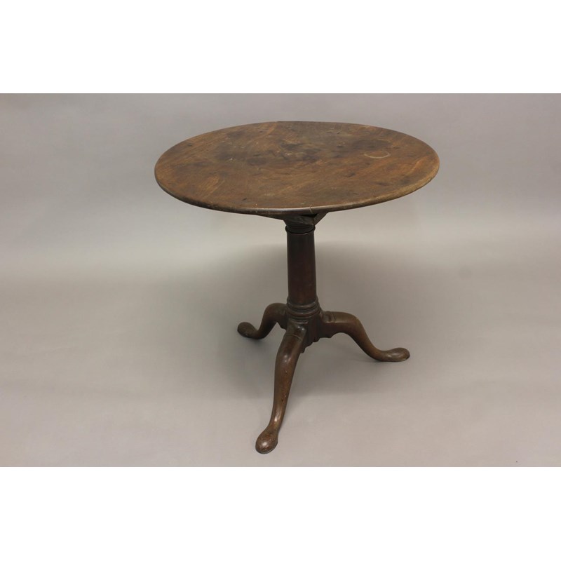 With a circular one piece revolving top on a 'birdcage' base with four turned uprights, on a turned tapering column and three down swept cabriole legs with pad feet. 69cm diameter, 66cm high.