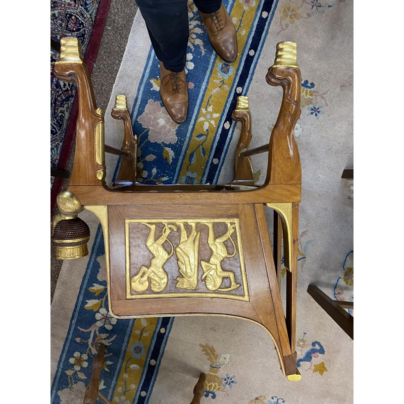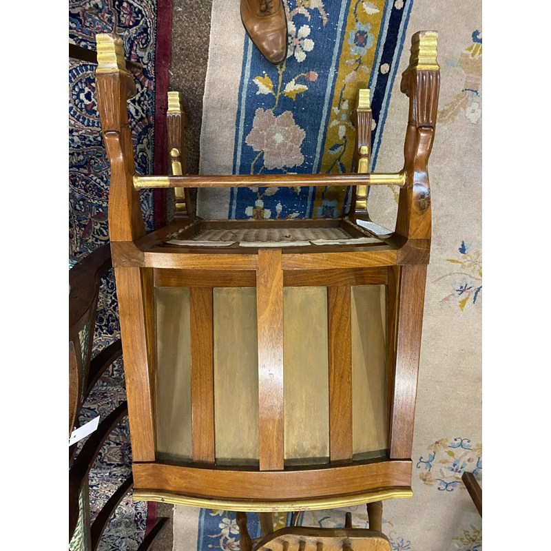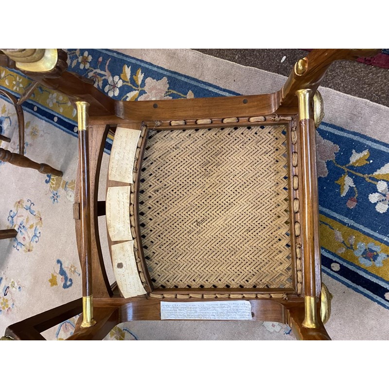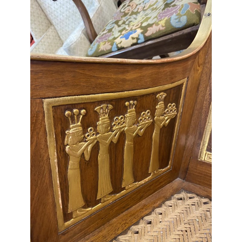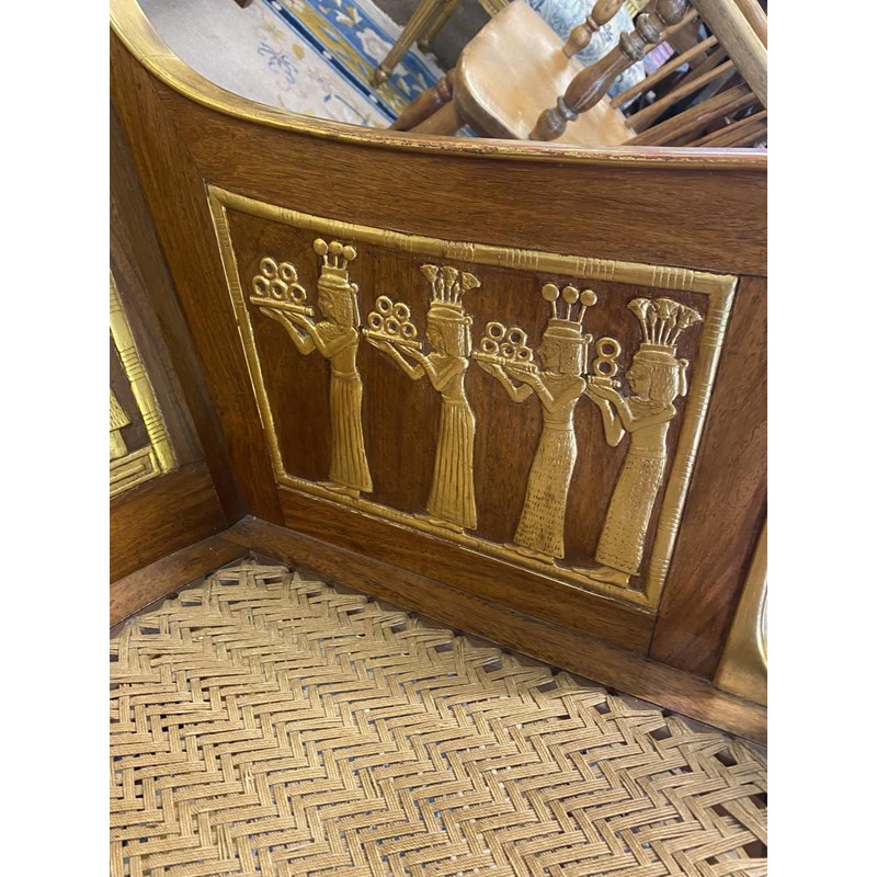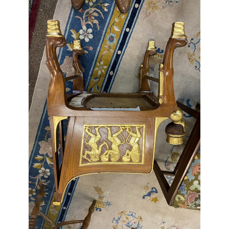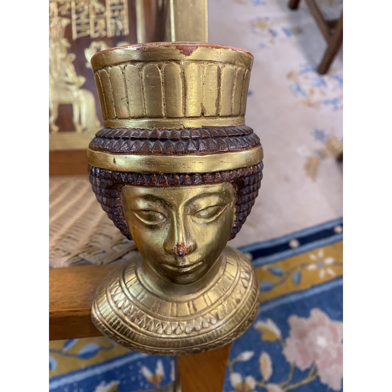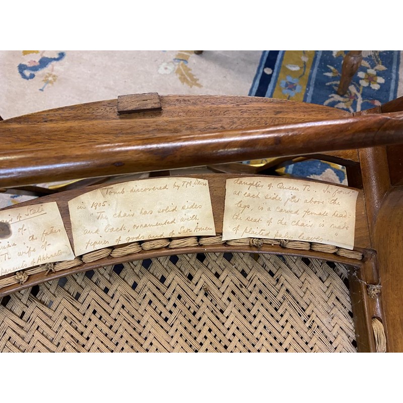A fine copy of the Throne of Princess Sitamun, daughter of Pharaoh Amenhotep III (1391-1353). With all over gilt metal mounts, the back with two seated figures sitting back to back with servants in attendance, the sides with further attendant figures, on animal paw legs on gilt feet, the seat with woven rush, and projecting gilt female heads, 870cm high, 56cm wide and 58cm deep.