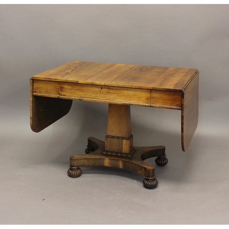 With a rectangular top with drop flap ends above a single blind fronted frieze drawer and beeded border, on a central stepped column, platform base and lobed feet with recessed casters, 70cm high, 169 x 65cm open.