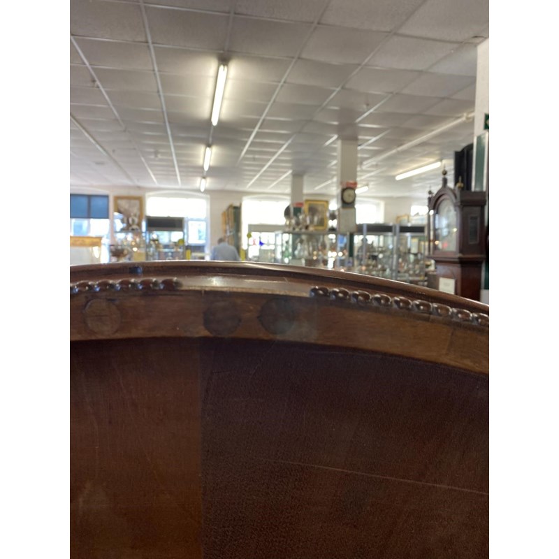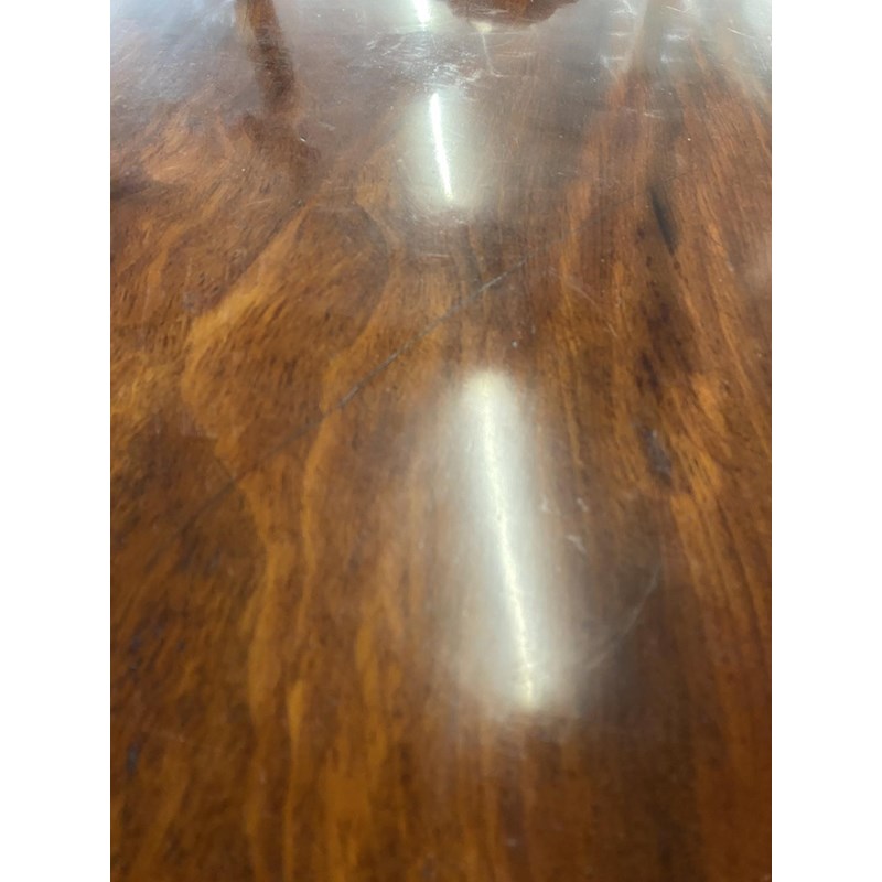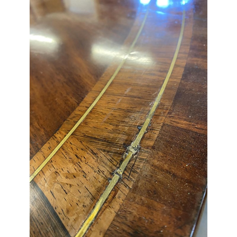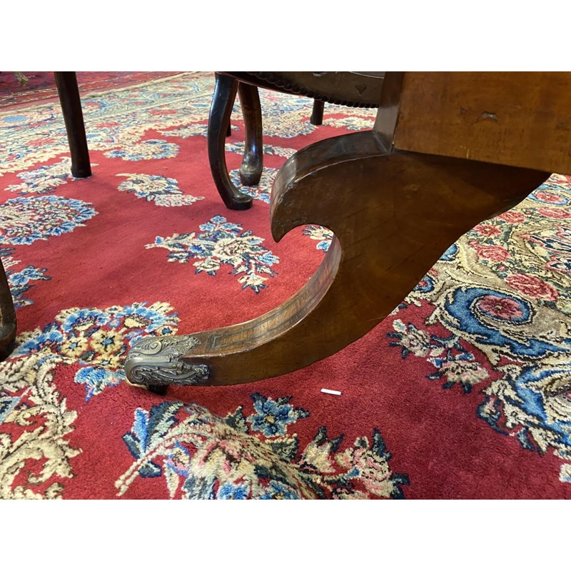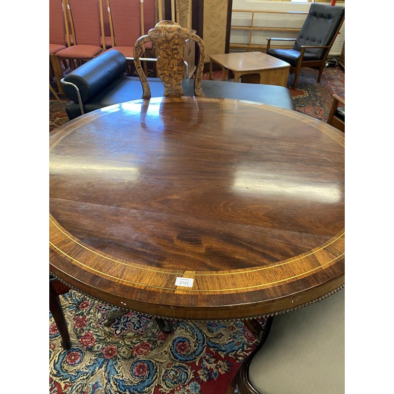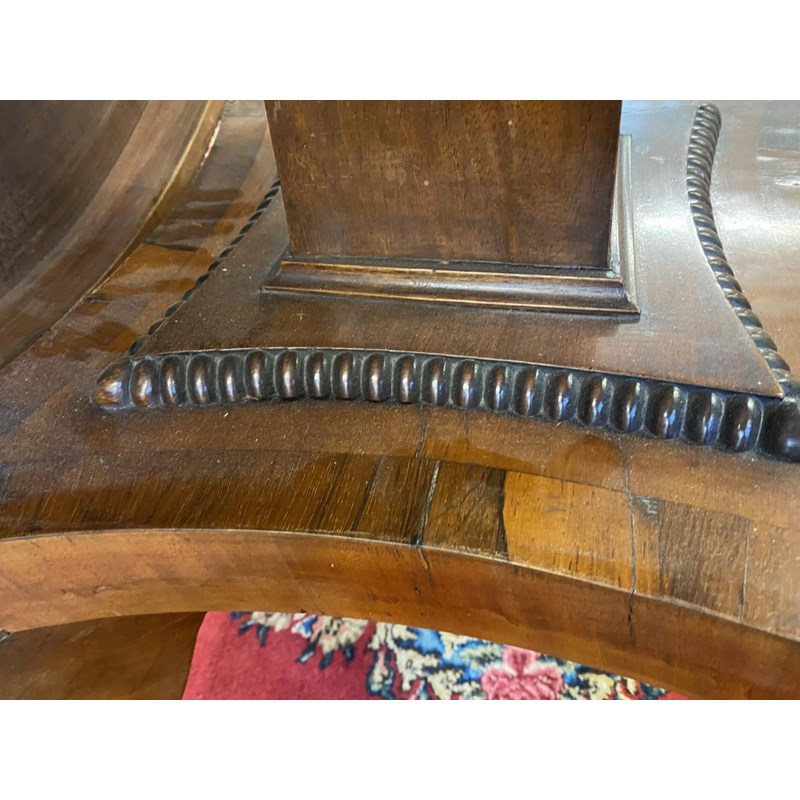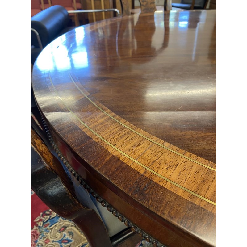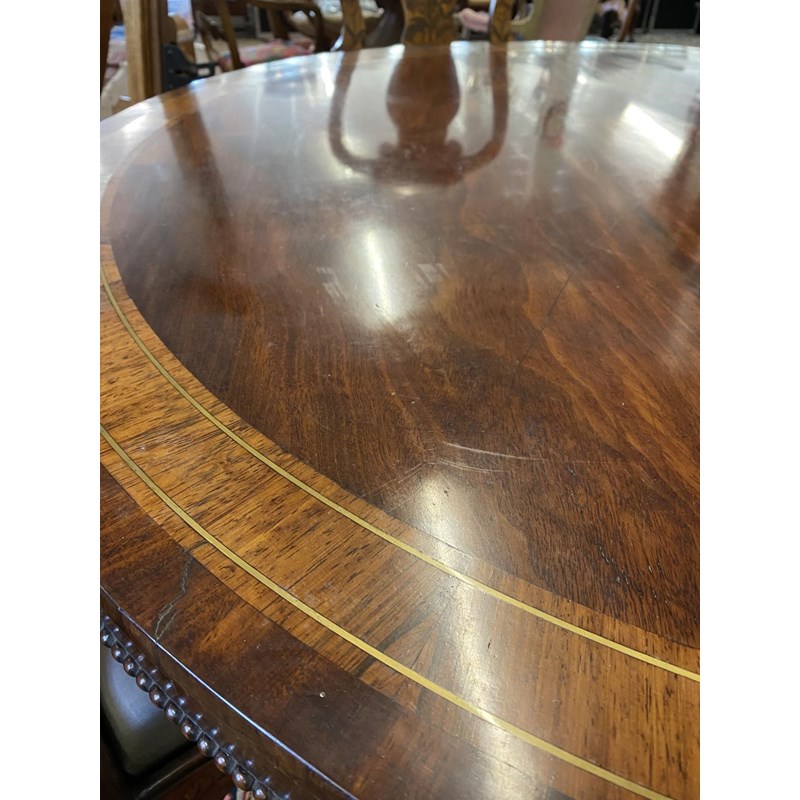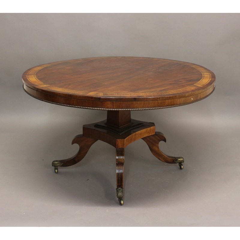 With a broad circular top with two lines of brass stringing and broad crossbanding, tipping on a square column and platform base with four scrolling 'sabre' legs with cast brass cap castors, 72cm high, 127cm wide.
