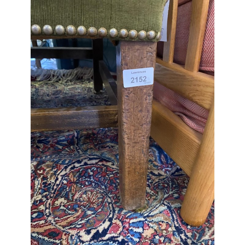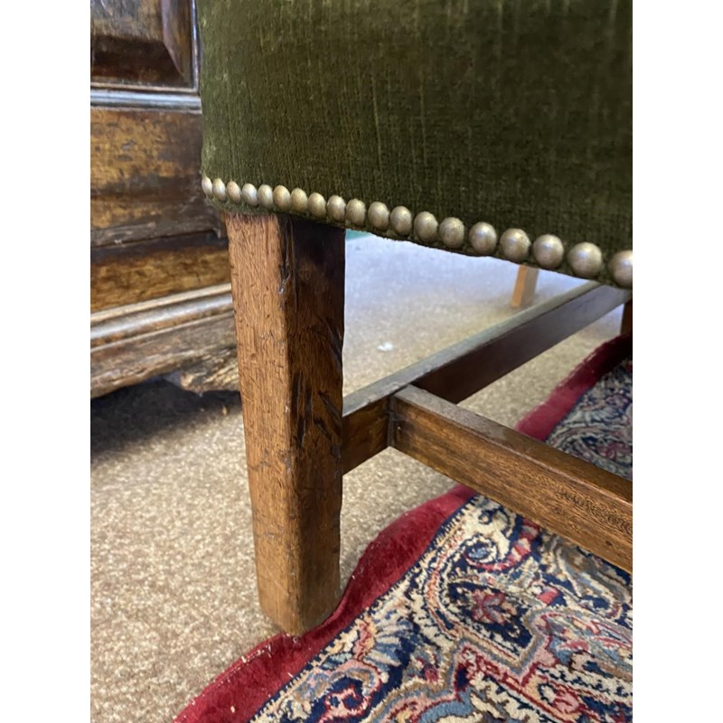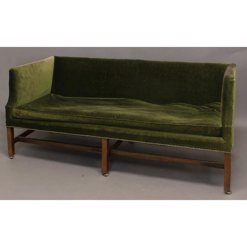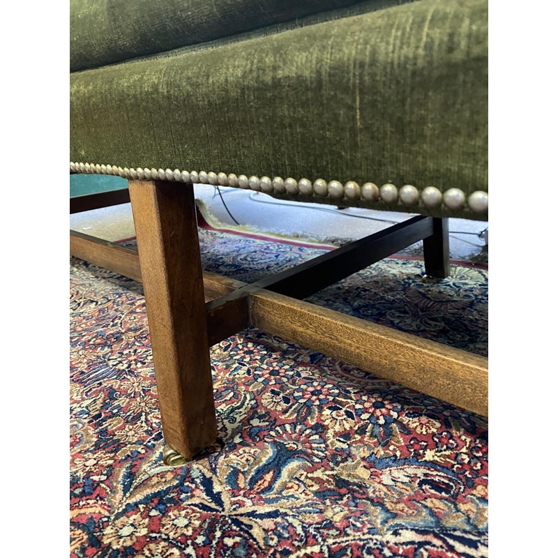 The settee upholstered in green velvet, with low rectangular back and similar arms on square legs and stretchers with brass casters, 83cm high, 184cm wide and 74cm deep.