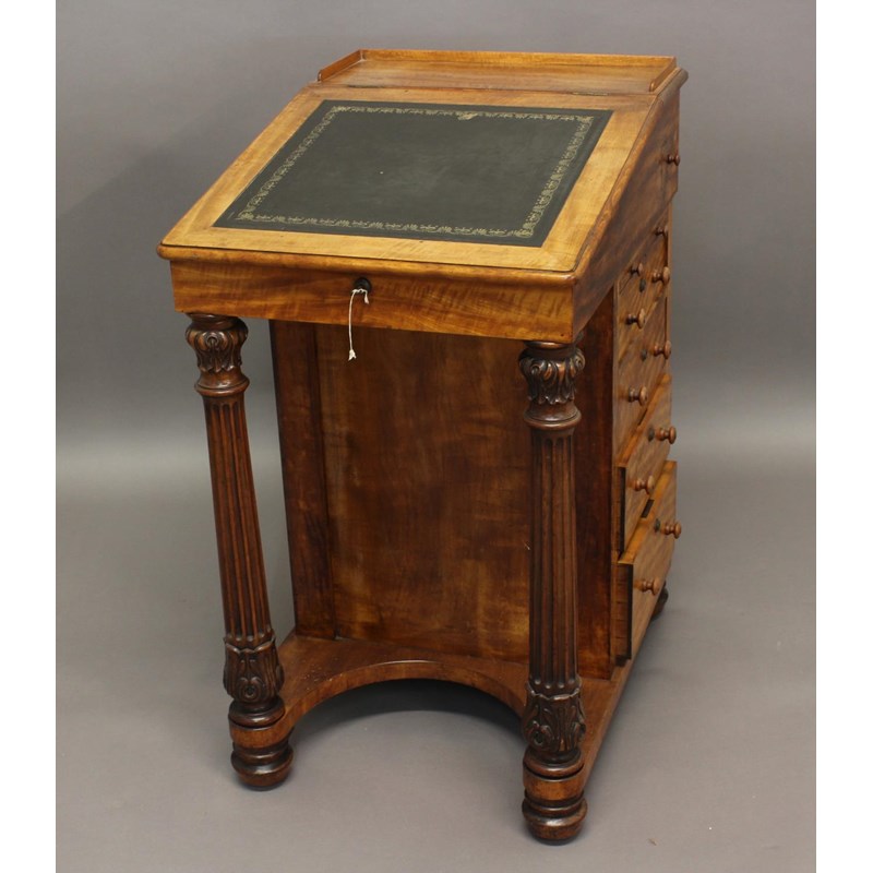 A WILLIAM IV SATINWOOD AND MAHOGANY DAVENPORT with fitted interior, side drawers and slides, the writing slope on fluted columns; 49 x 84 cms