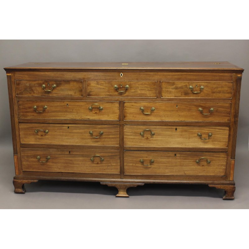 A GEORGE III MAHOGANY HALL CHEST with hinged top, drawers and dummy drawers in the front and reeded pilasters; 180 x 105 cms