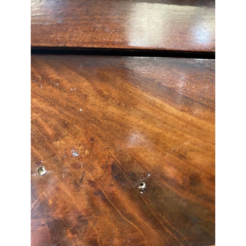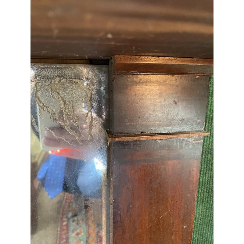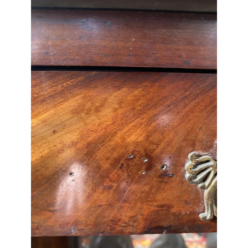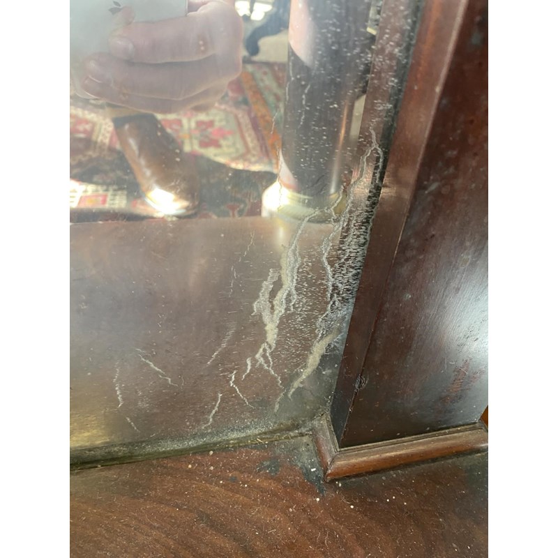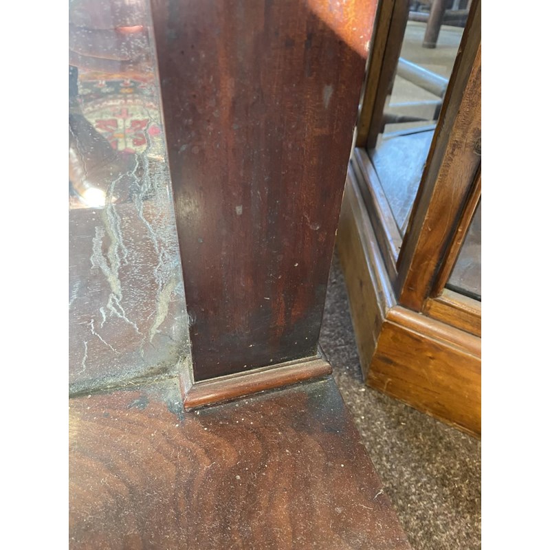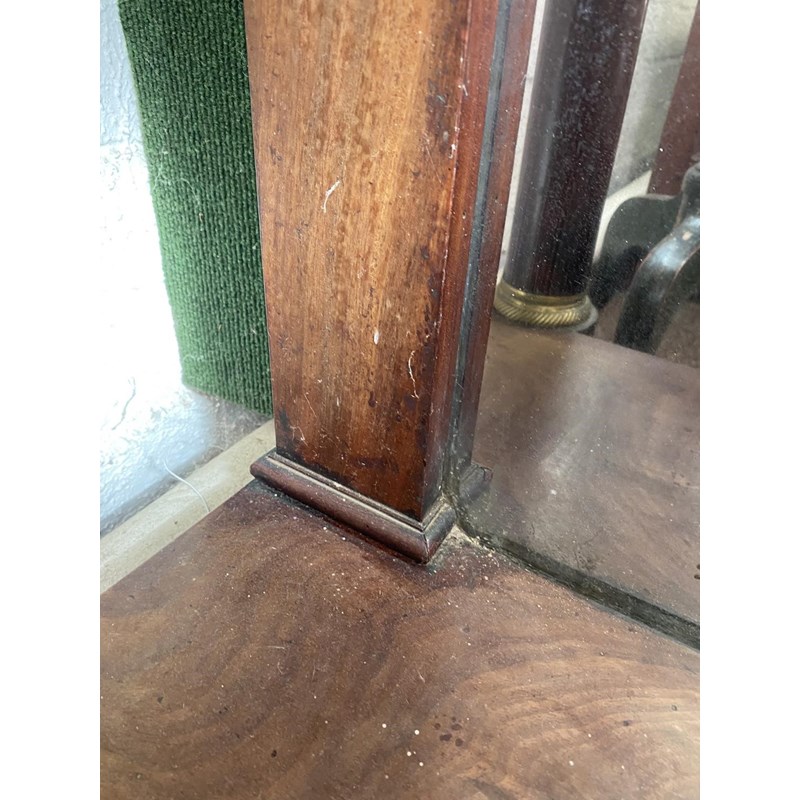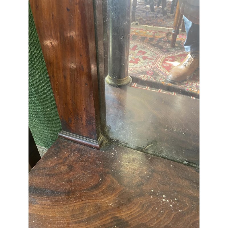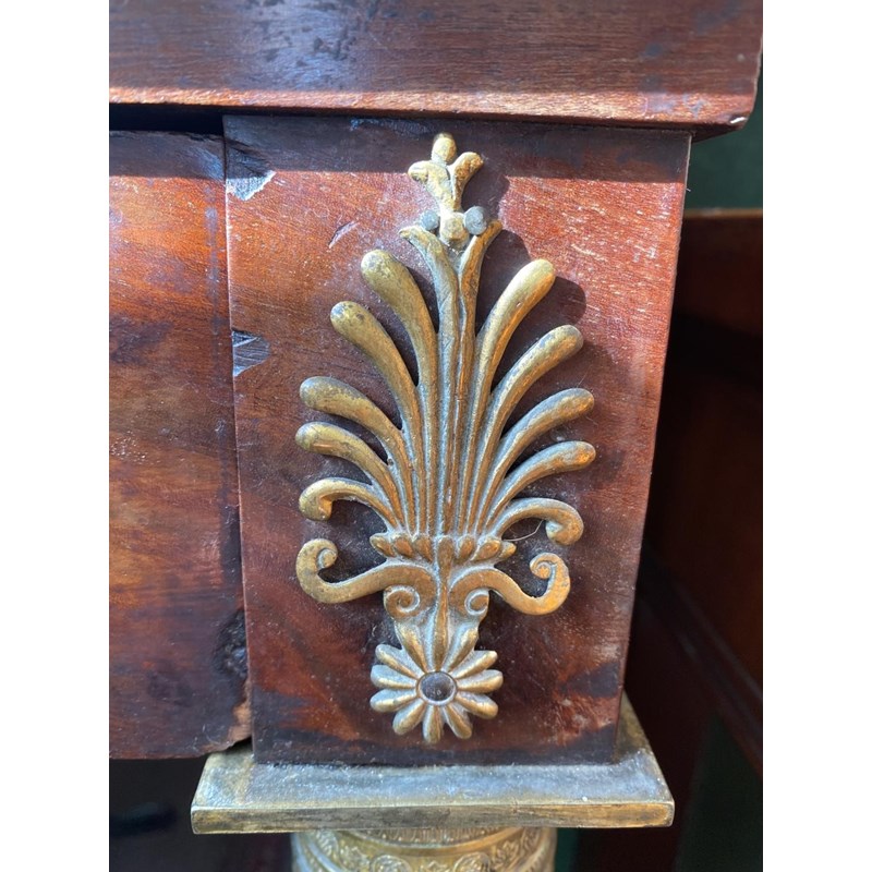 Each with rectangular veined grey marble tops above a single frieze drawer fronted by a gilt metal mount with two facing swans drinking from a fountain, the drawer flanked by flowering roses, above mirrored backs and shelves, with turned mahogany columns with gilt metal mounts, on rounded legs, 96cm high, 77cm wide and 31cm deep. (2)