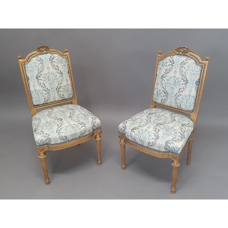 A PAIR OF LOUIS XVI STYLE SALON CHAIRS, 19th century, the gilt frames with pierced ribbon top rails on reeded legs, with upholstered padded seats and backs, 95cm high