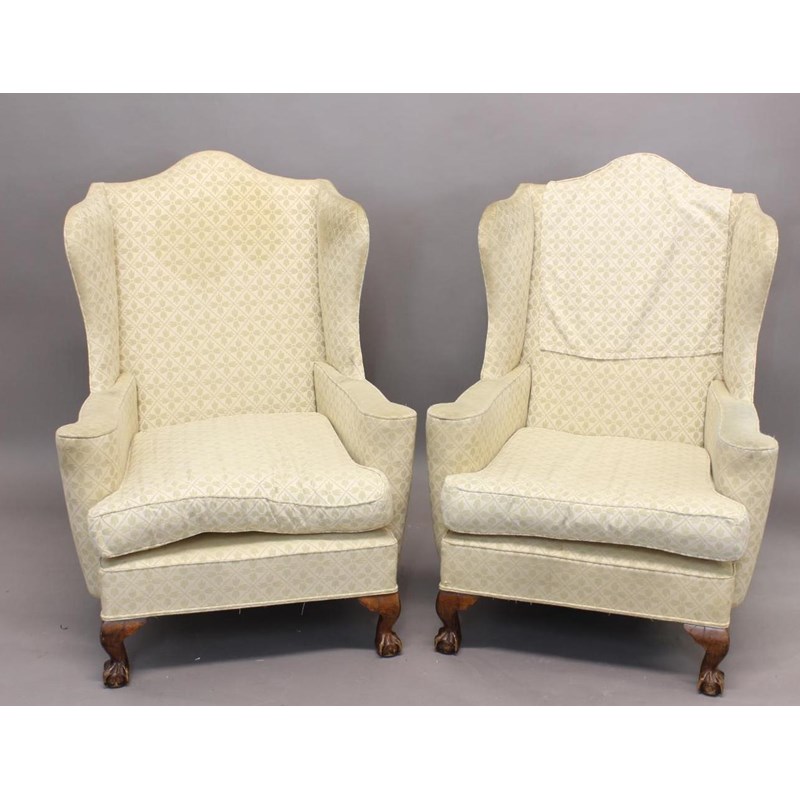 A PAIR OF QUEEN ANNE STYLE WING BACK ARM CHAIRS.