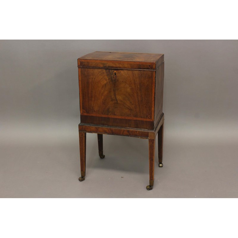 A GEORGE III MAHOGANY CELLARETTE crossbanded and on tapering legs; 39 cms
