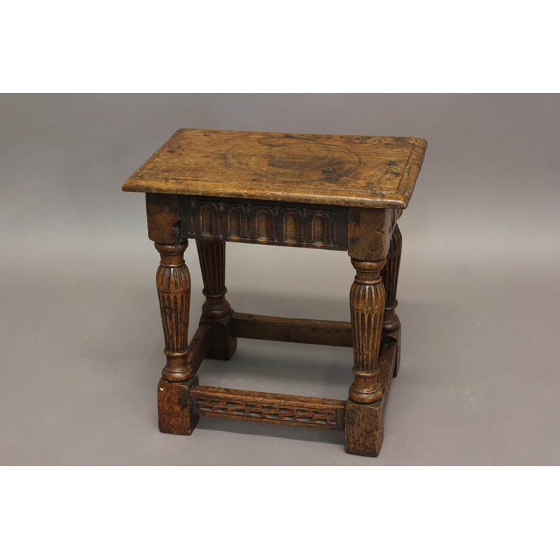 AN OAK JOINT STOOL OF 16TH CENTURY DESIGN with gouged frieze and fluted legs; 43 cms