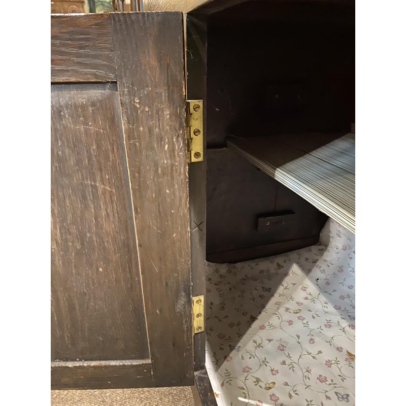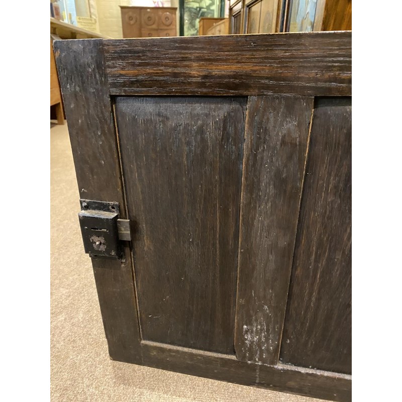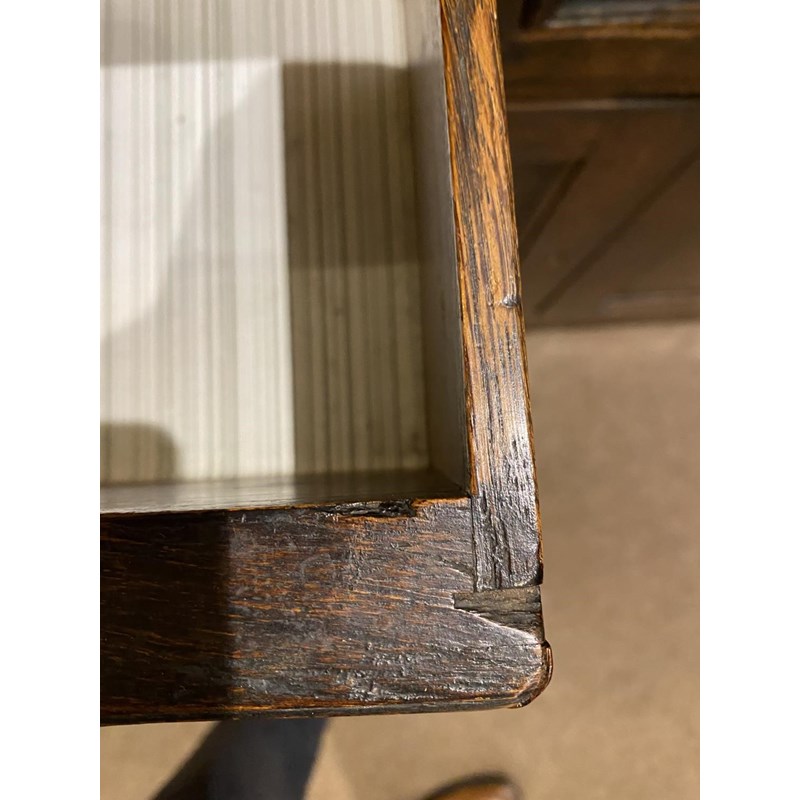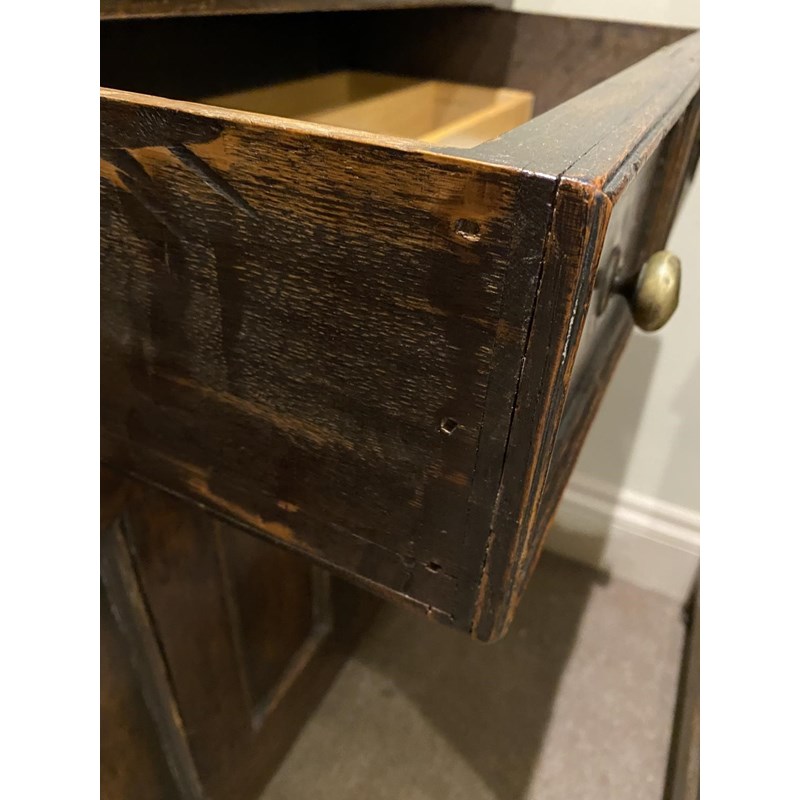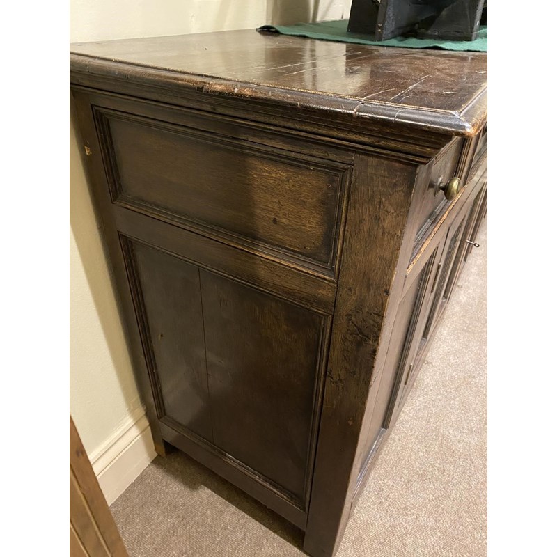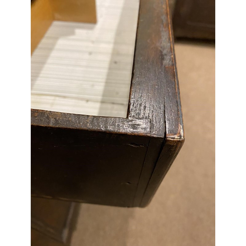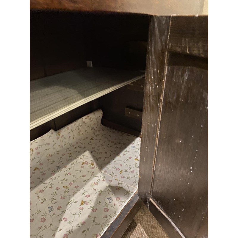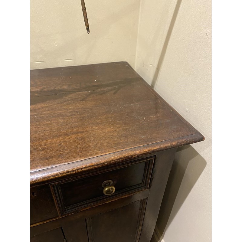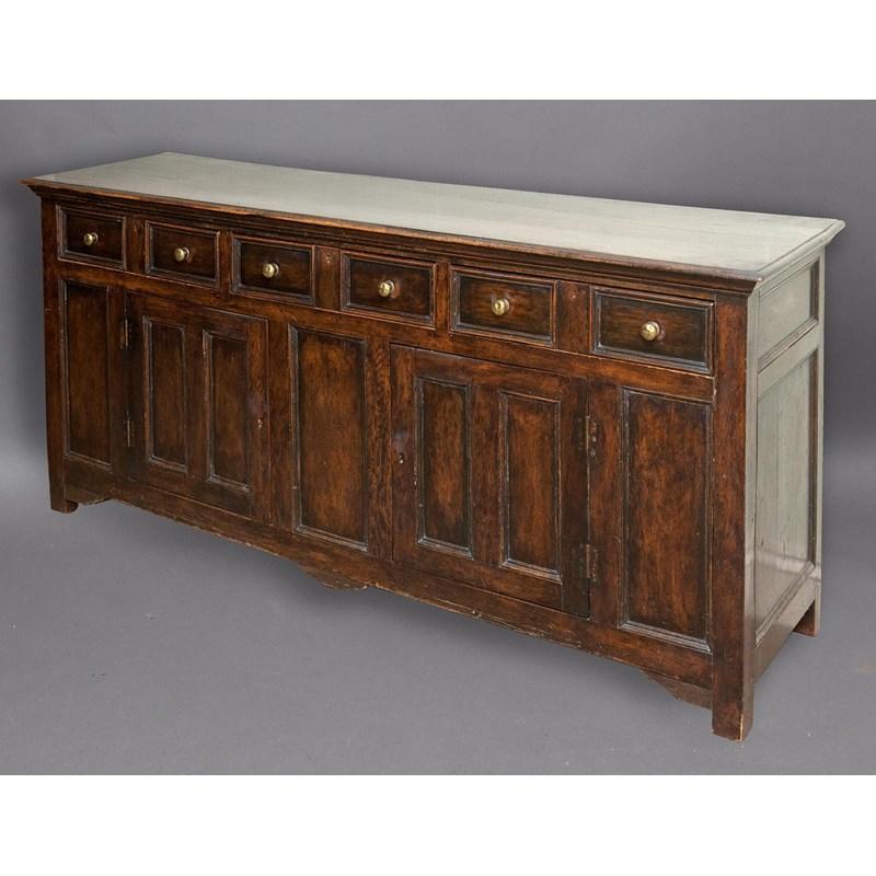 With a broad rectangular top with a moulded edge above three double fronted drawers above two panelled cupboard doors, 90cm high, 203cm wide and 54cm deep.