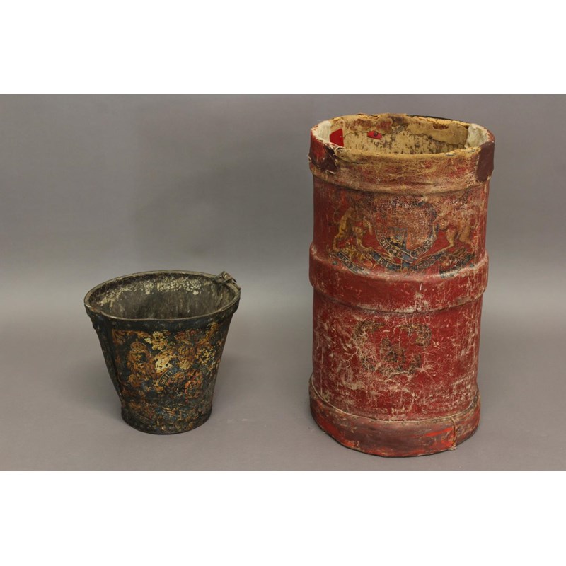 A RED PAINTED CANVAS STAND 59 cms high and a Fire Bucket, each with remnants of the Royal Arms (2)