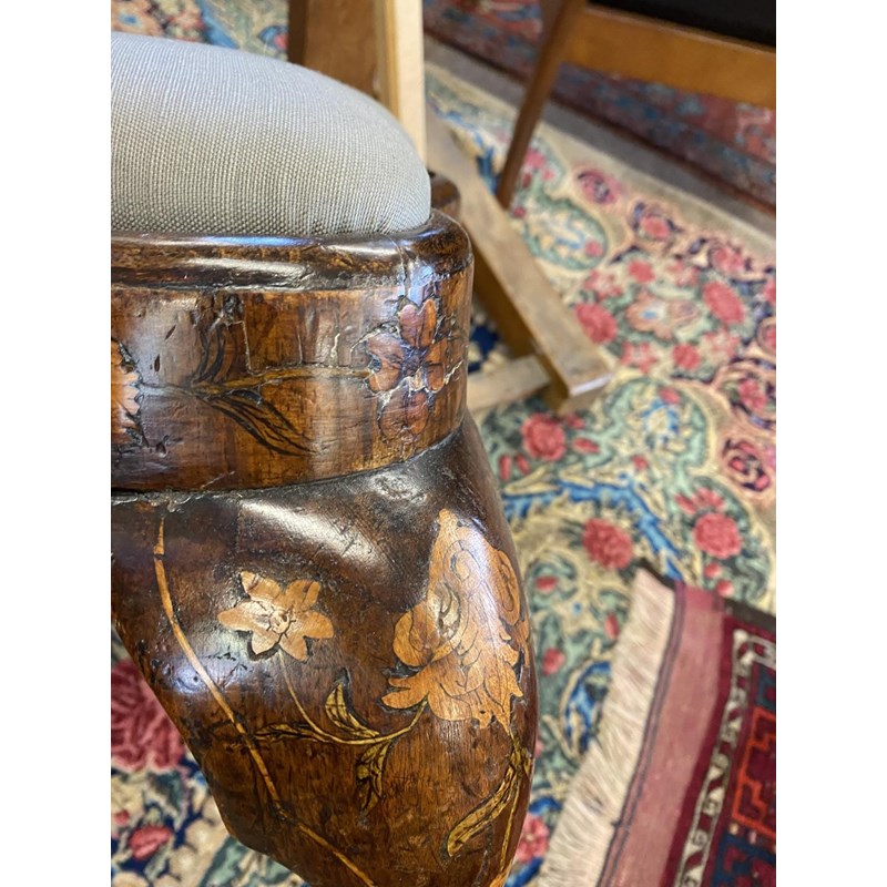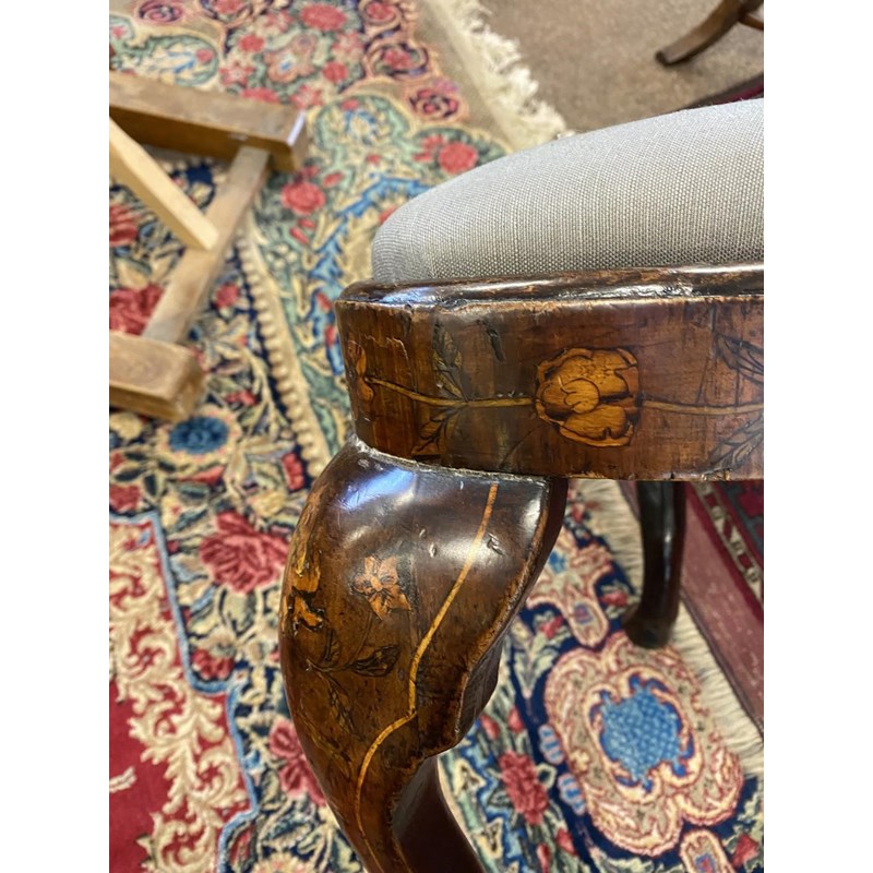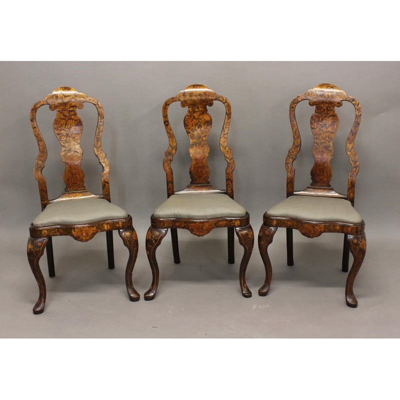 A SET OF FOUR DUTCH MARQUETRY DINING CHAIRS. With tall 'Queen Anne' style backs with allover floral and bird marquetry in a vase, with drop in seats on curved seat rails with conforming marquetry and cabriole front legs with pointed pad feet, 106cm high.