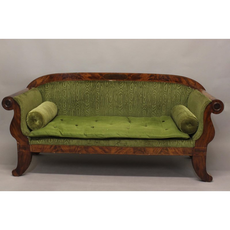 With a broad Mahogany show wood frame with satinwood stringing, the upholstered back, seat and cushions between scrolling arms and outswept legs, 93cm high, 198cm wide and 69cm deep.