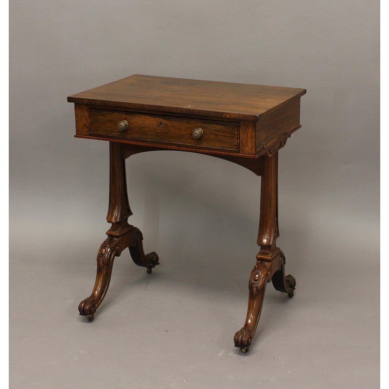 With a rectangular top above a single frieze drawer stamped 'Bulstrode Marylebone' and 'Paddington', on trestle end supports with carved foliate decoration and downswept legs and brass casters, 72cm high, the top 40.5 x 61cm.