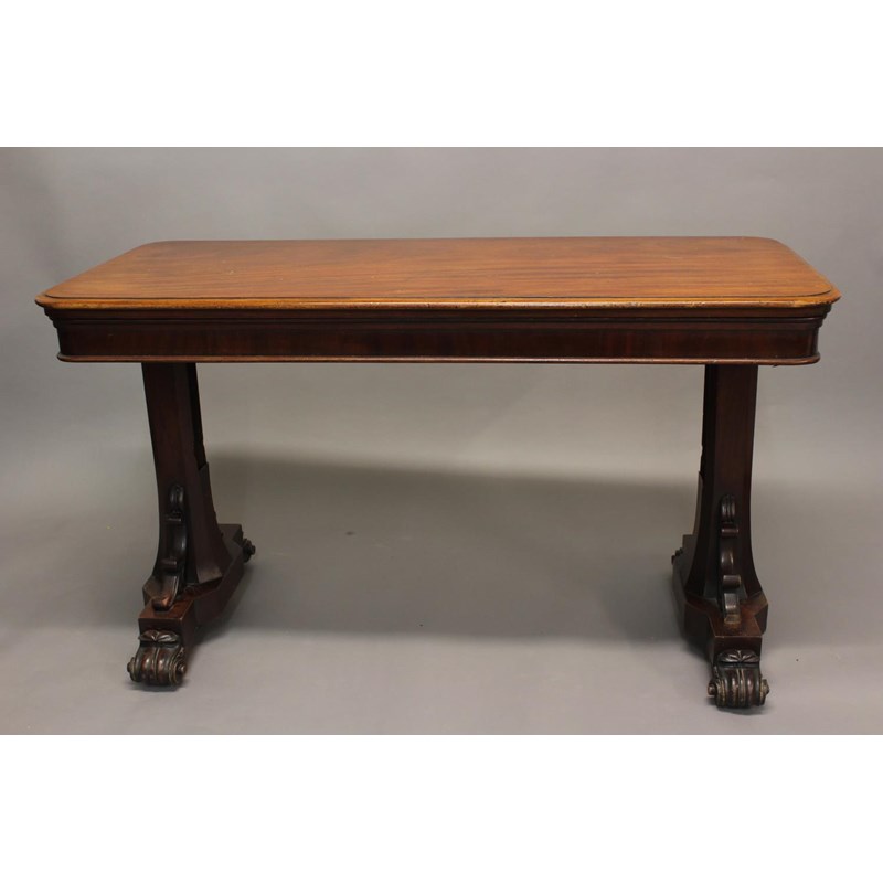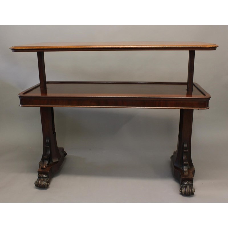 The rectangular top with moulded border rising to create a two-shelf dumb waiter, on tapering octaginal legs with platform bases and scrolling feet with recessed castors, 108cm open 78 cm closed, the top 60 x 138cm.