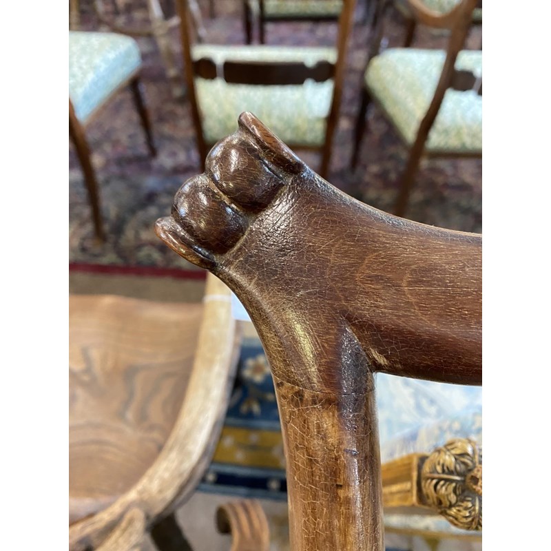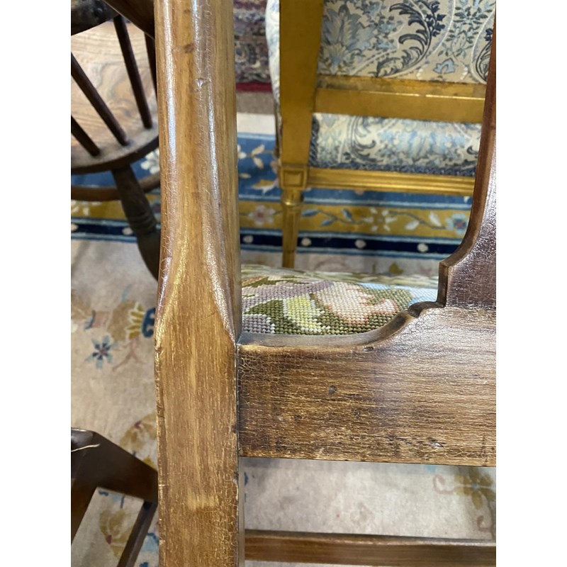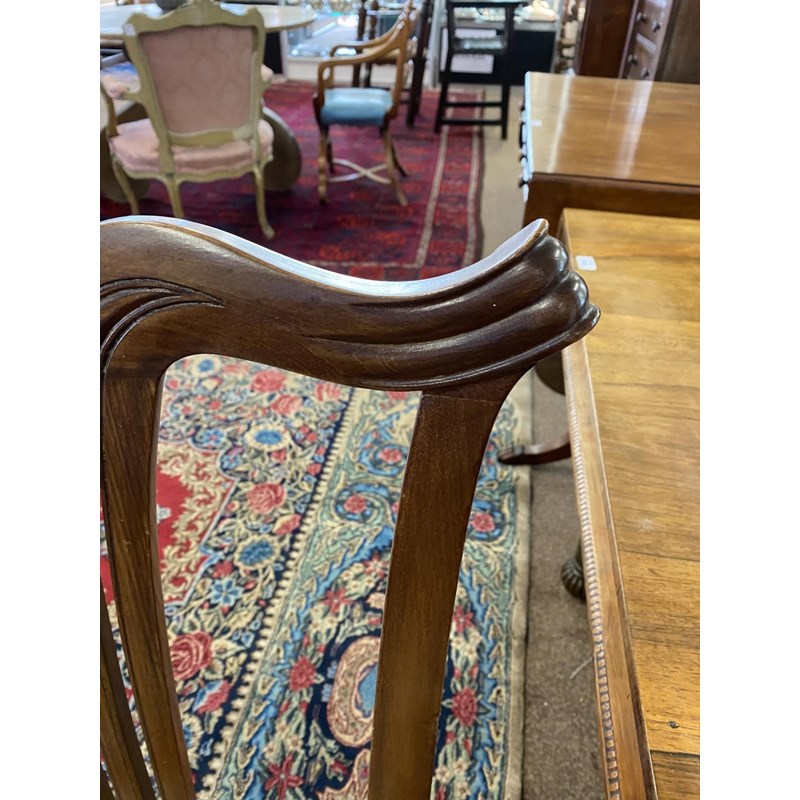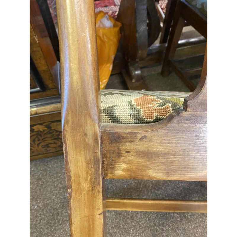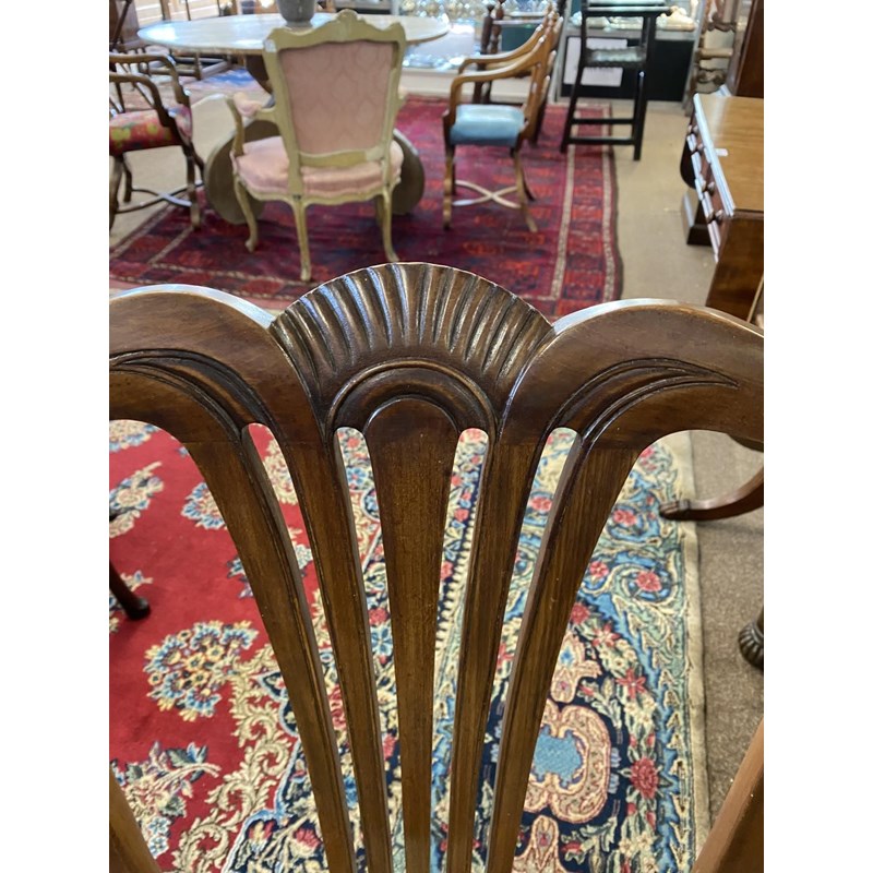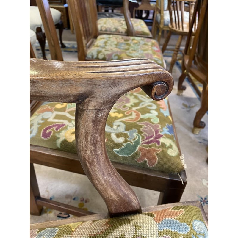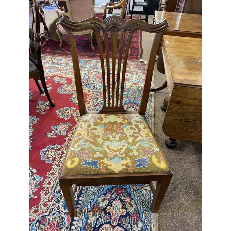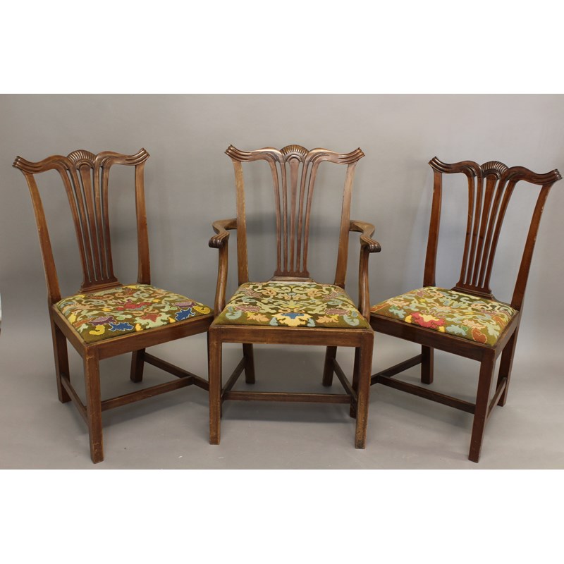 A SET OF FOURTEEN GEORGE III STYLE MAHOGANY DINING CHAIRS. Comprising twelve standard and two arm chairs, each with scrolling top rails with central fan motif above a pierced splat, drop in seat with needlework cover and square legs with 'H' form stretchers, 98cm high, 52cm wide, the arm chairs 101cm high and 62cm wide. (14)