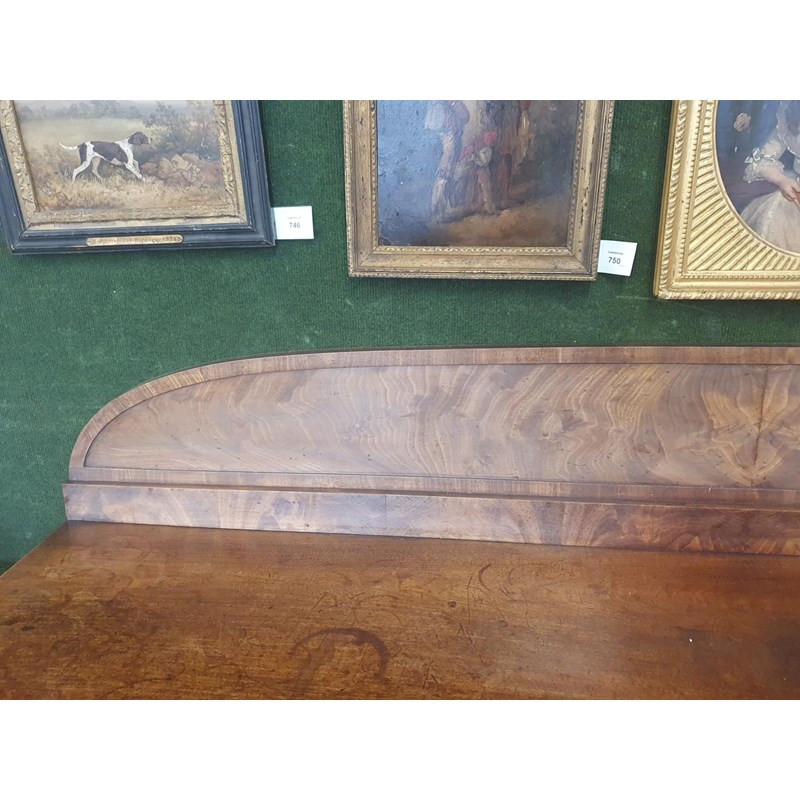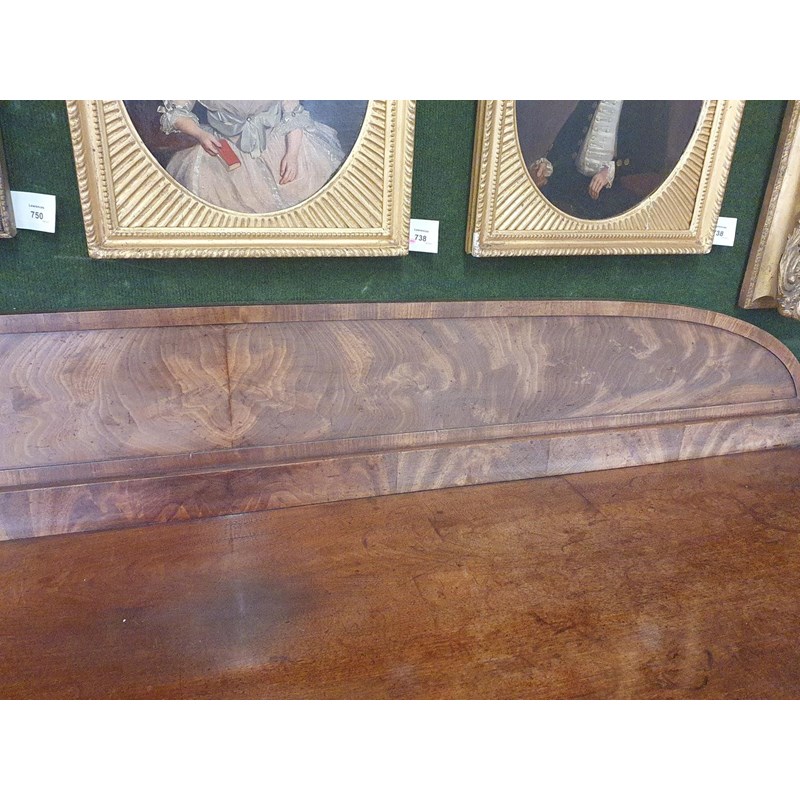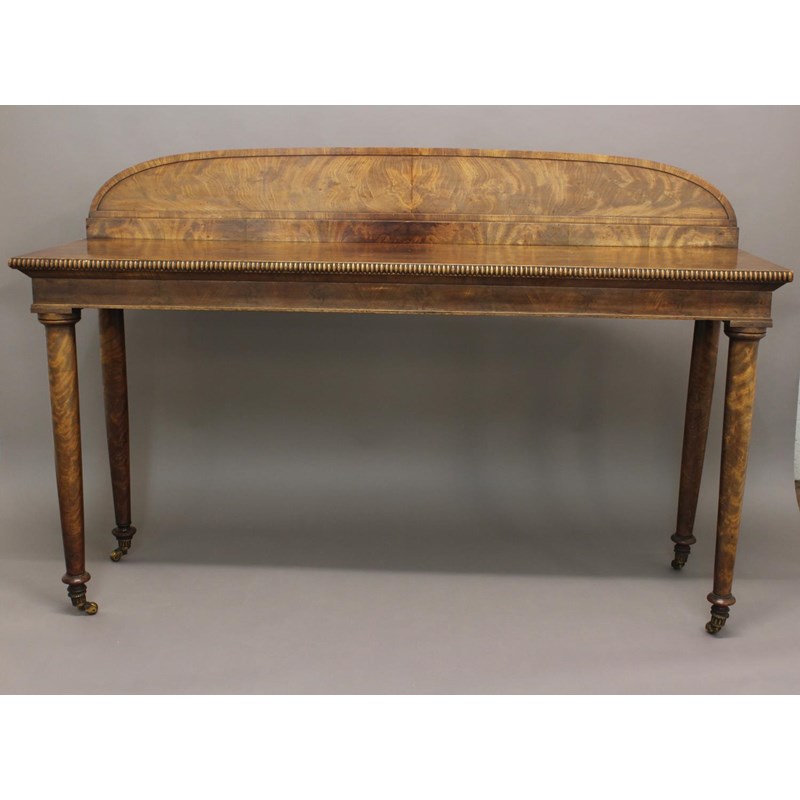 A REGENCY MAHOGANY SERVING TABLE. The rectangular top with beeded border and a raised curved back, on four tall, turned tapering legs with brass ball casters, 122cm high, 183cm wide, 55cm deep