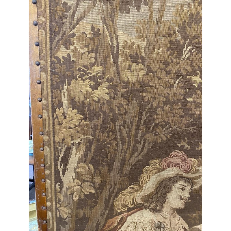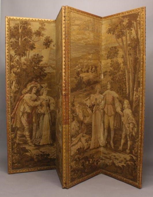 A LARGE FOUR FOLD TAPESTRY COVERED SCREEN.