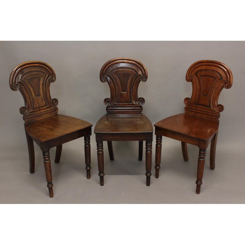 A SET OF THREE VICTORIAN MAHOGANY HALL CHAIRS.