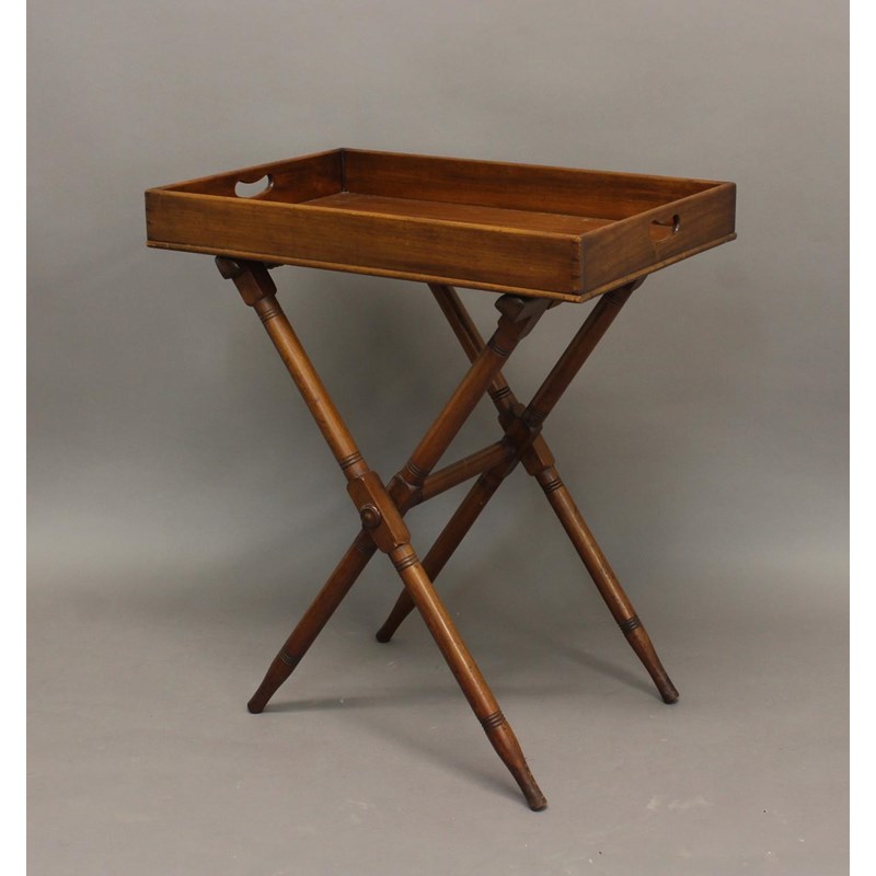 A VICTORIAN MAHOGANY BUTLERS TRAY AND STAND. The rectangular tray with raised border and twin pierced hand holds, on a folding turned base, 84cm high 72cm wide and 49cm deep.