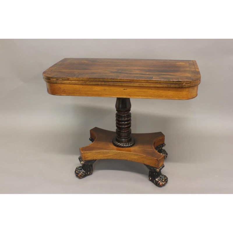 A REGENCY ROSEWOOD AND BRASS STRUNG TEA TABLE.