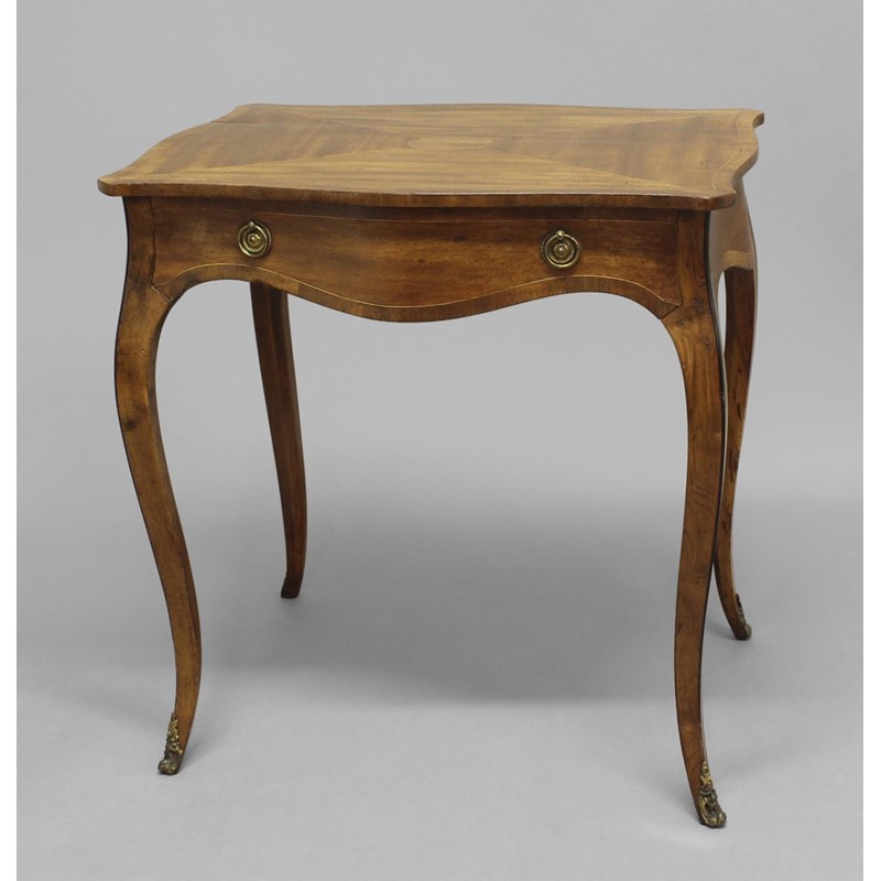 the shaped rectangular top above a single drawer on slender cabriole legs, height 74cm, width 71cm, depth 50cm