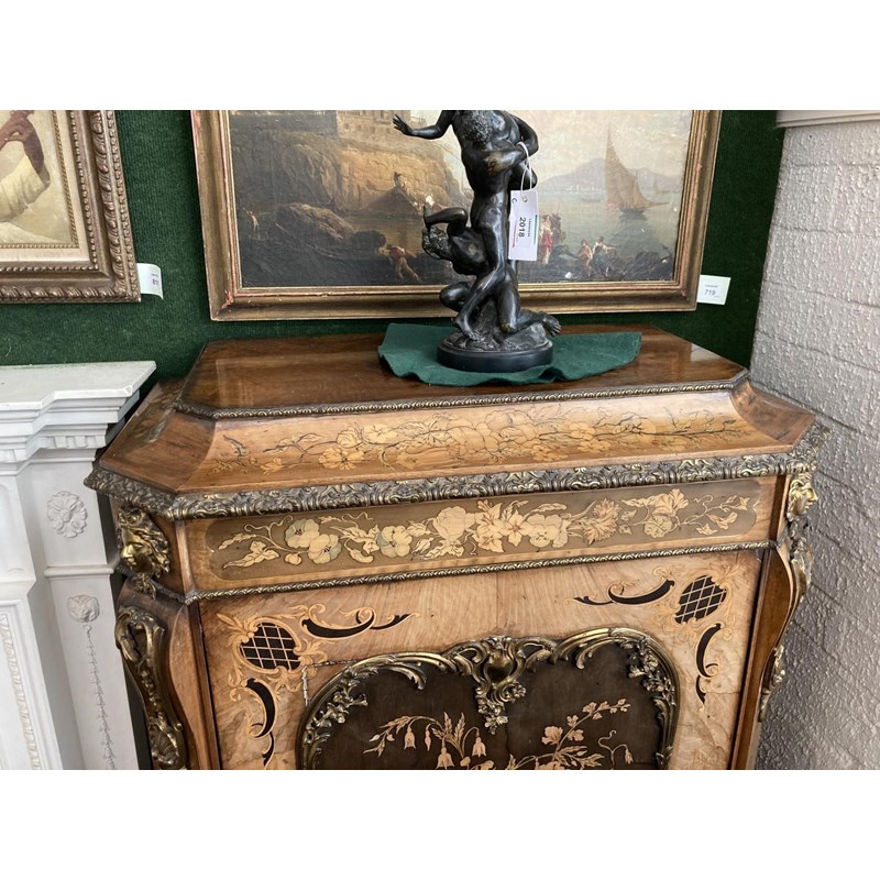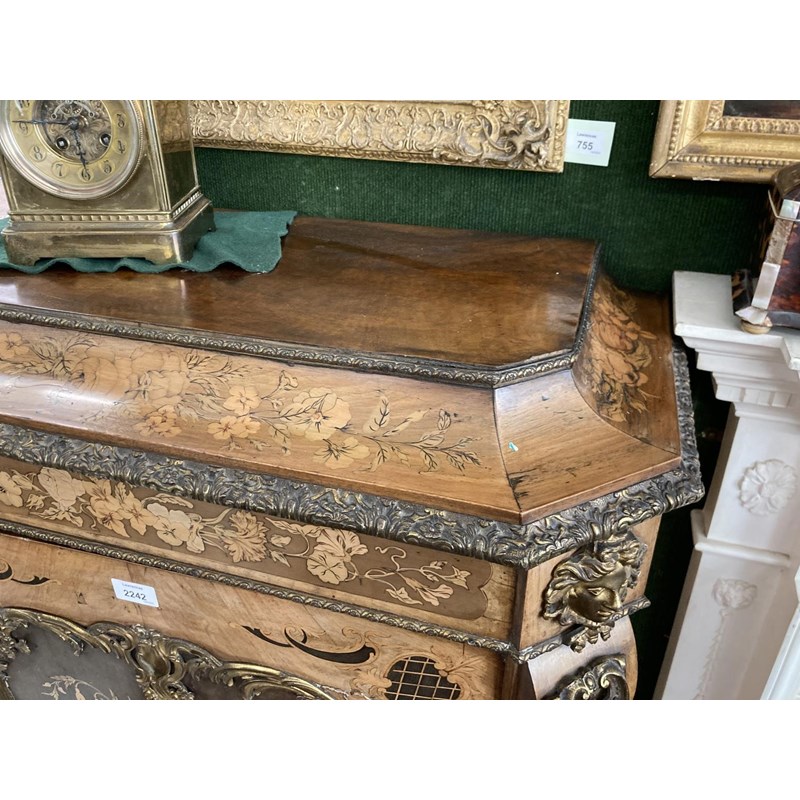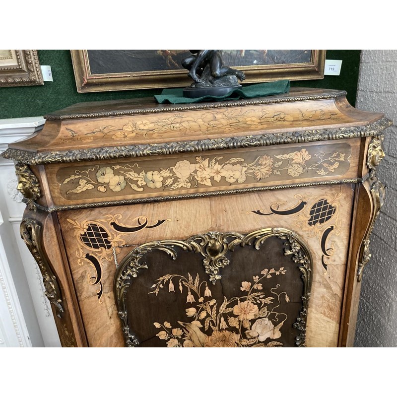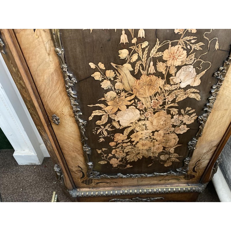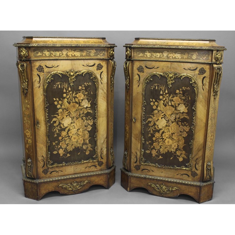 Each with rectangular tops with canted front corners above downswept sides with scrolling floral marquetry and gilt brass mounts,above a similar frieze and doors with central panels of marquetry flowers and grasses within a gilt brass rococo revival mount, the doors enclosing interiors with velvet lined shelves, on conforming bases, the sides with four gilt patera. With matching keys, 124cm high, 74cm wide and 40cm deep. One with a paper label for 'T.H. Filmer's Cabinet Chair Upholstery ... 32 Berners Street'.