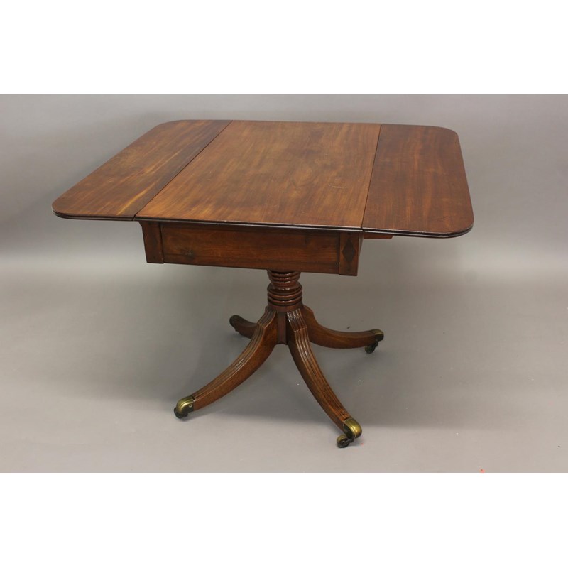 A REGENCY MAHOGANY BREAKFAST TABLE with frieze drawer on pillar and four reed splayed legs; 84 cms wide