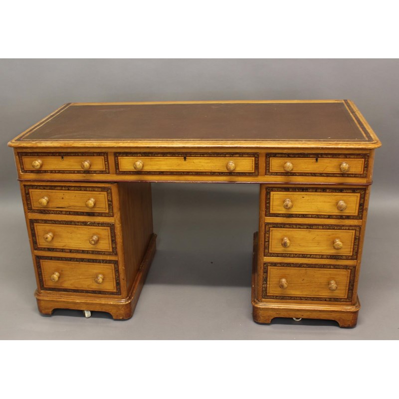 A VICTORIAN PAINTED PINE AND ROSEWOOD EFFECT WRITING DESK. With a rectangular top with moulded edges and leather effect writing surface above three frieze drawers and columns of three further graduated short drawers, all with painted stringing and rosewood effect crossbanding, 76cm high, 130cm wide and 62cm deep.