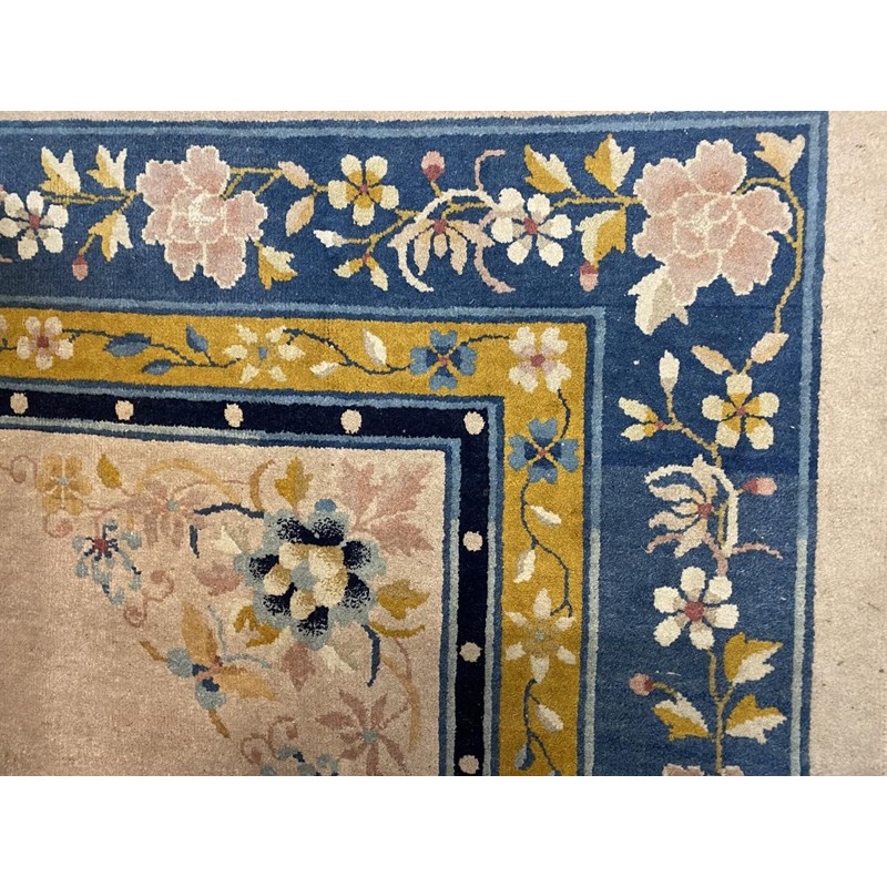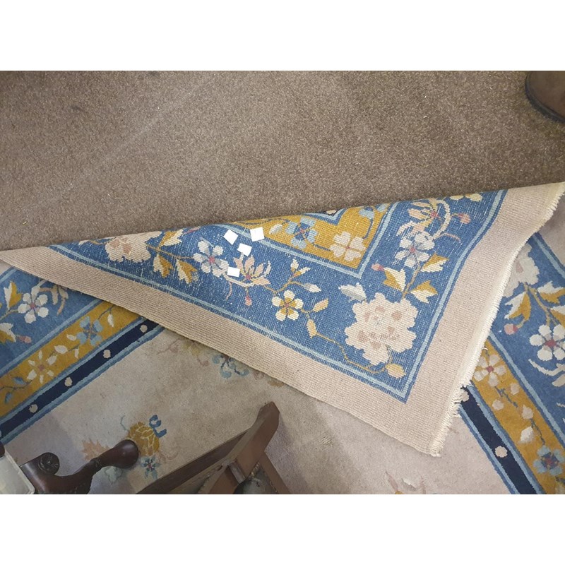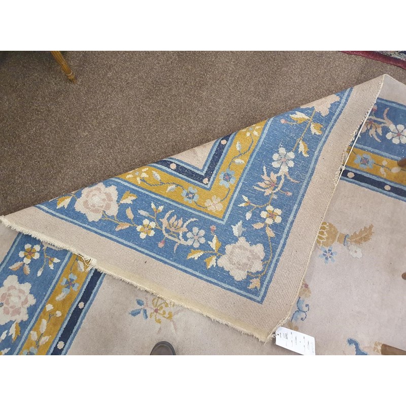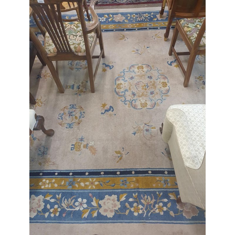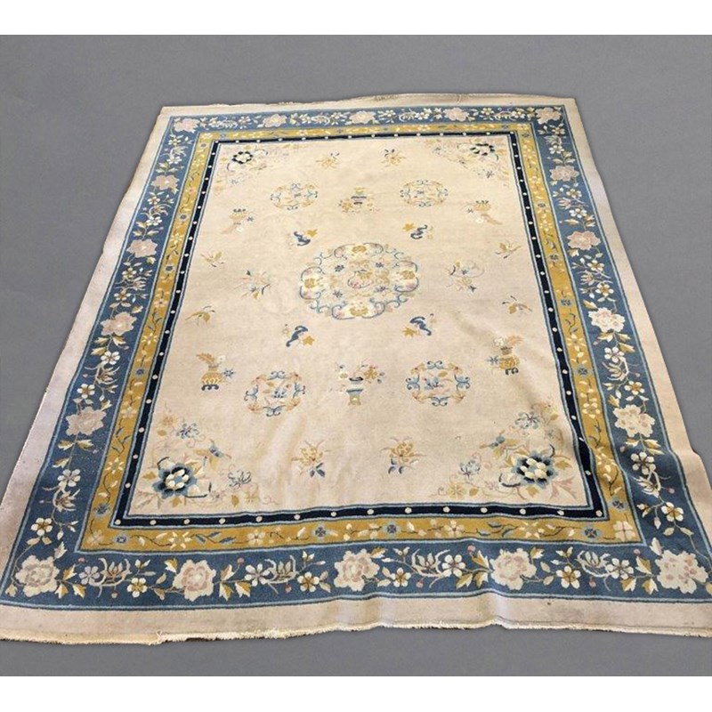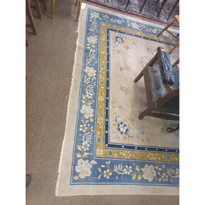 CHINESE CARPET, EARLY 20TH CENTURY The cream field of Taoist motifs and semi naturalistic flowers centred by a floral roundel framed by spandrels and cobalt borders of flowering vines flanked by an inner mustard guard stripe, 365 x 270cmÂ