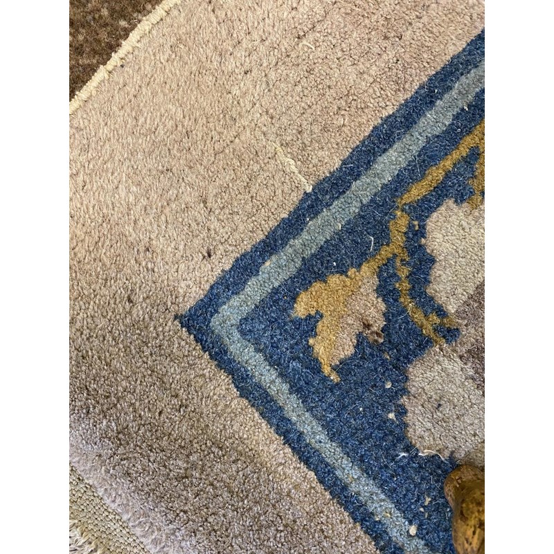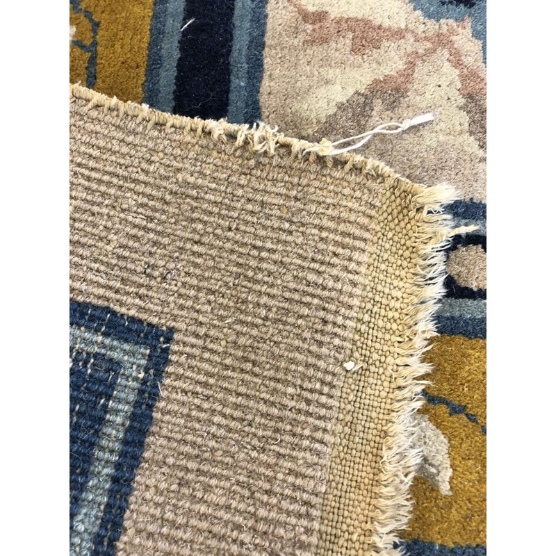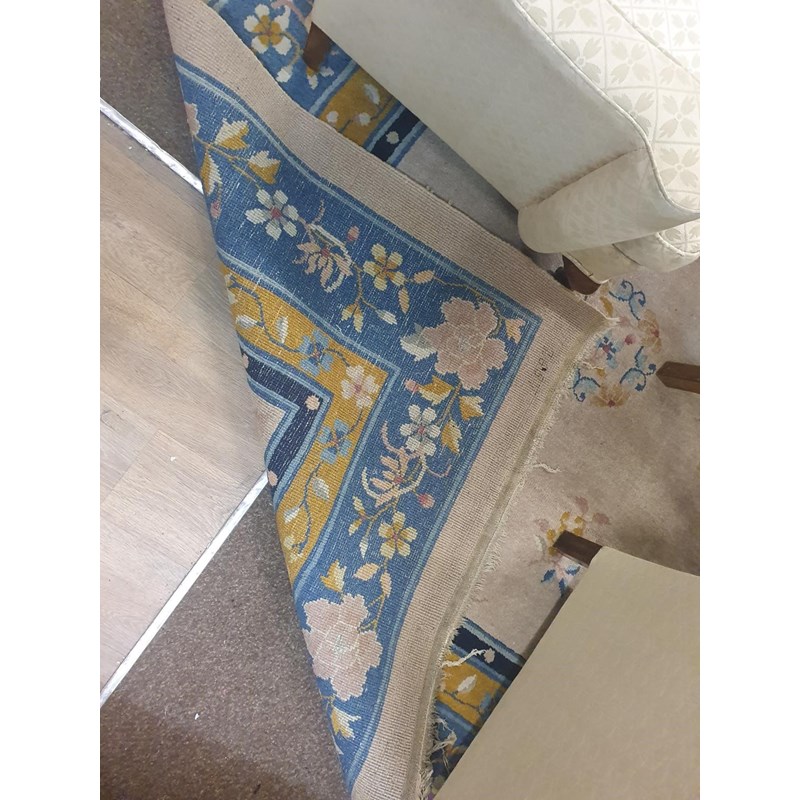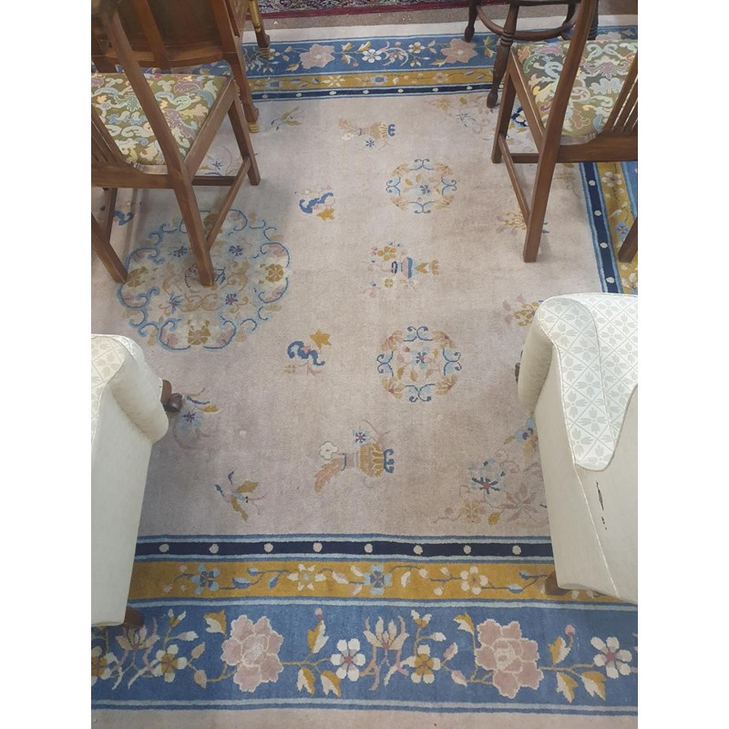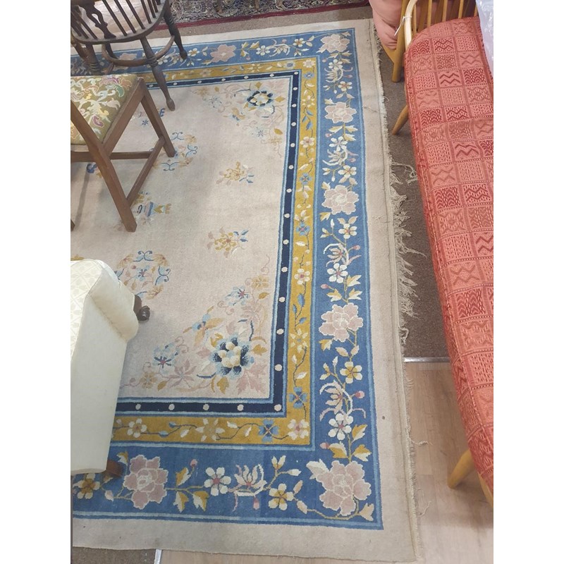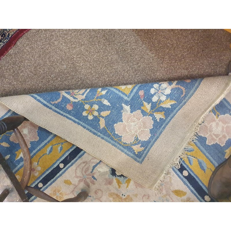 CHINESE CARPET, EARLY 20TH CENTURY The cream field of Taoist motifs and semi naturalistic flowers centred by a floral roundel framed by spandrels and cobalt borders of flowering vines flanked by an inner mustard guard stripe, 365 x 270cmÂ