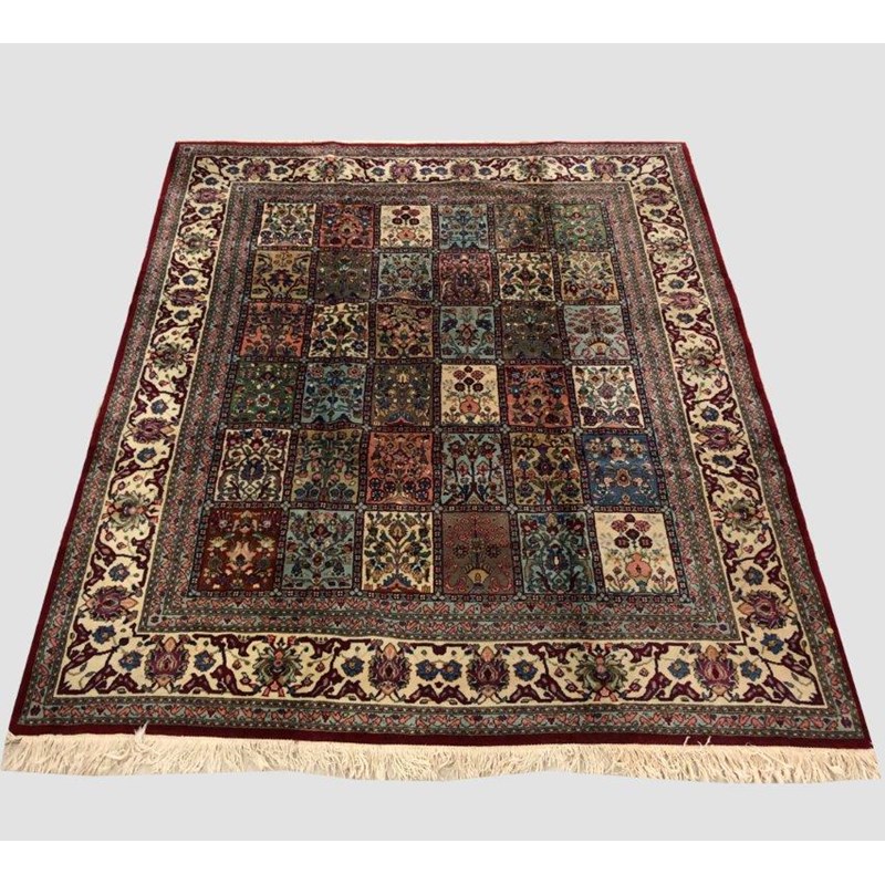 AN INDIAN CARPET, the compartmentalised field of polychrome flowering plants enclosed by ivory borders of palmettes and vines flanked by sky blue guard stripes, 291cm x 263cm