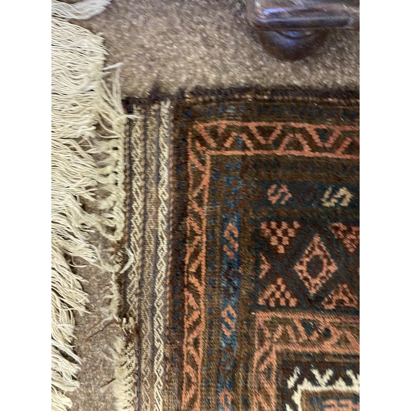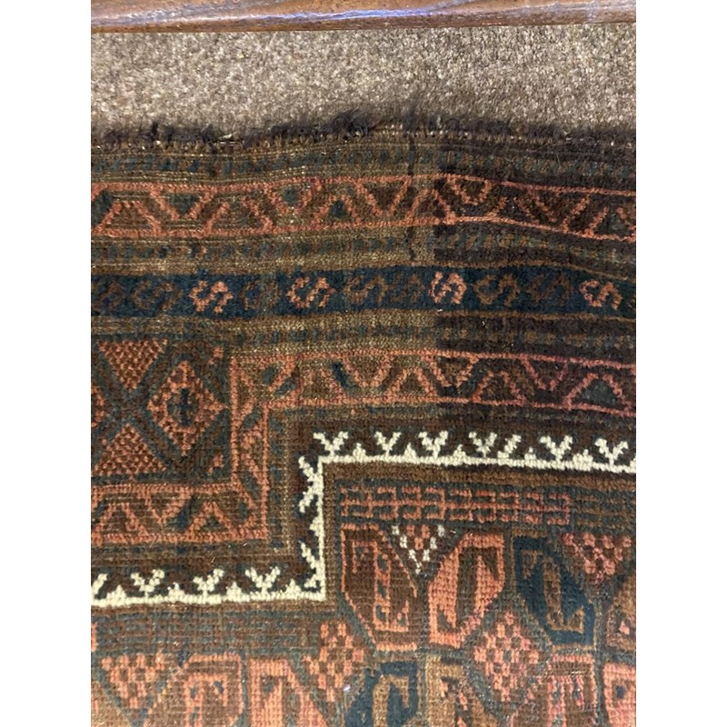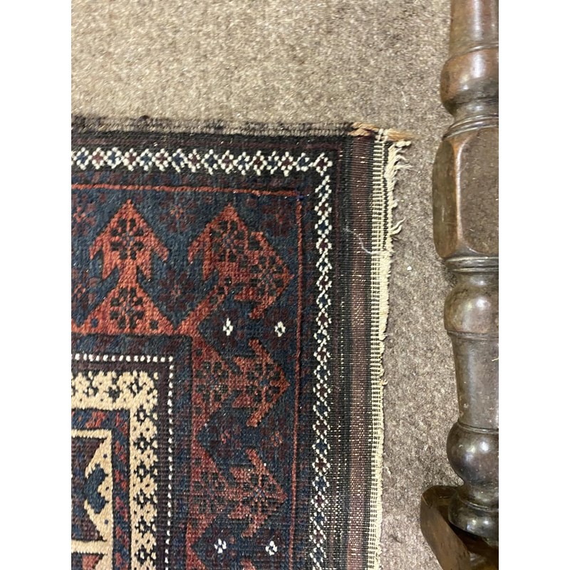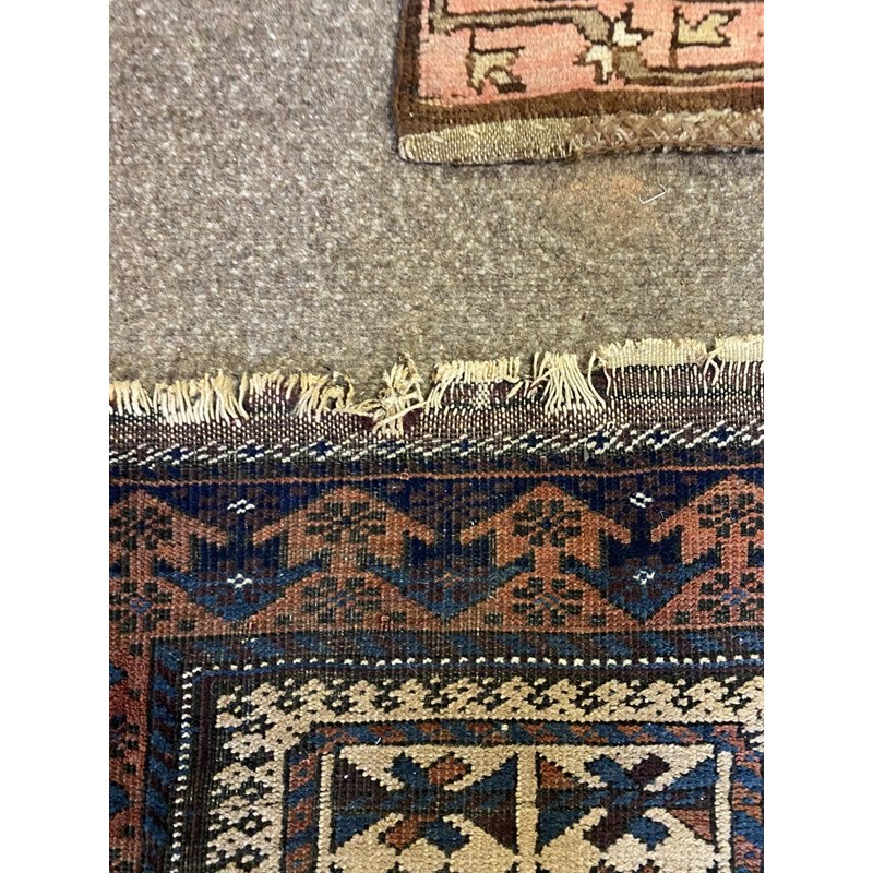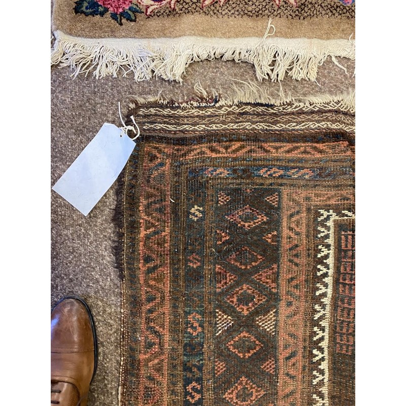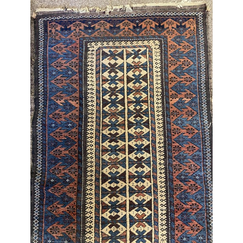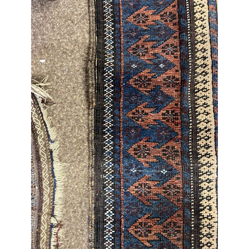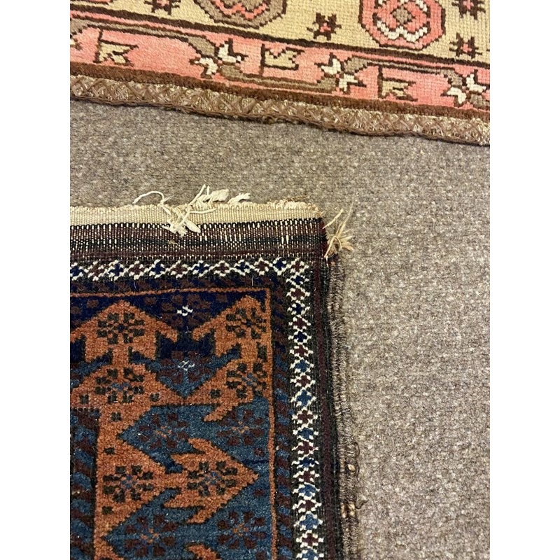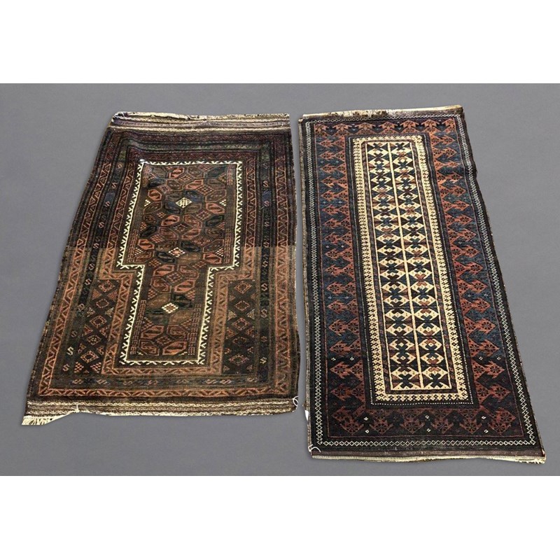 BALUCH RUG, KHORASAN EAST IRAN, CIRCA 1900 The compartmentalised diamond lattice camel ground enclosed by reciprocal arrow head borders and guard stripes, 130 x 90cm, together with a Baluch Prayer Rug, 145 x 70cm (2)