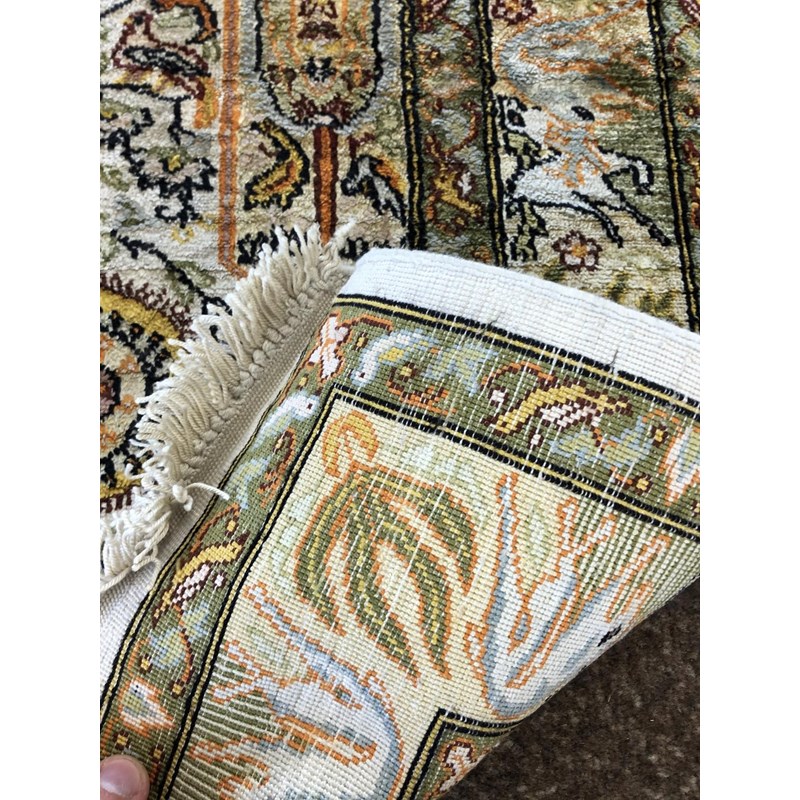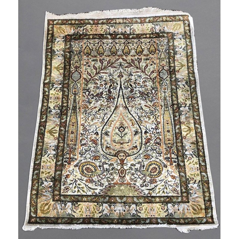 SILK PILED PRAYER RUG, PROBABLY KASHMIR, CIRCA 1970, The ivory field with central plant beneath the Mihrab flanked by two further trees and borders of exotic birds and guard stripes, 110 x 85cm