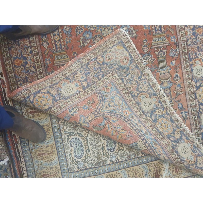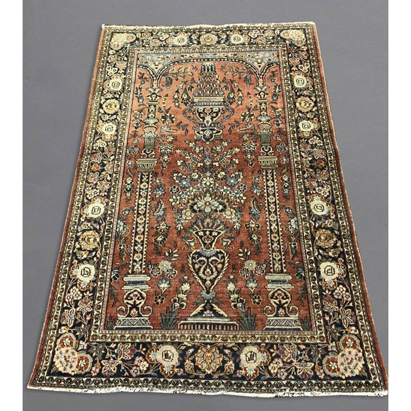 The terracotta field with urn issuing flowers flanked by a pair of columns beneath a hanging lamp and Mihrab enclosed by indigo borders of meandering vines and palmettes, flanked by carnation guard stripes, 200 x 125cm