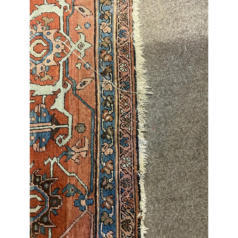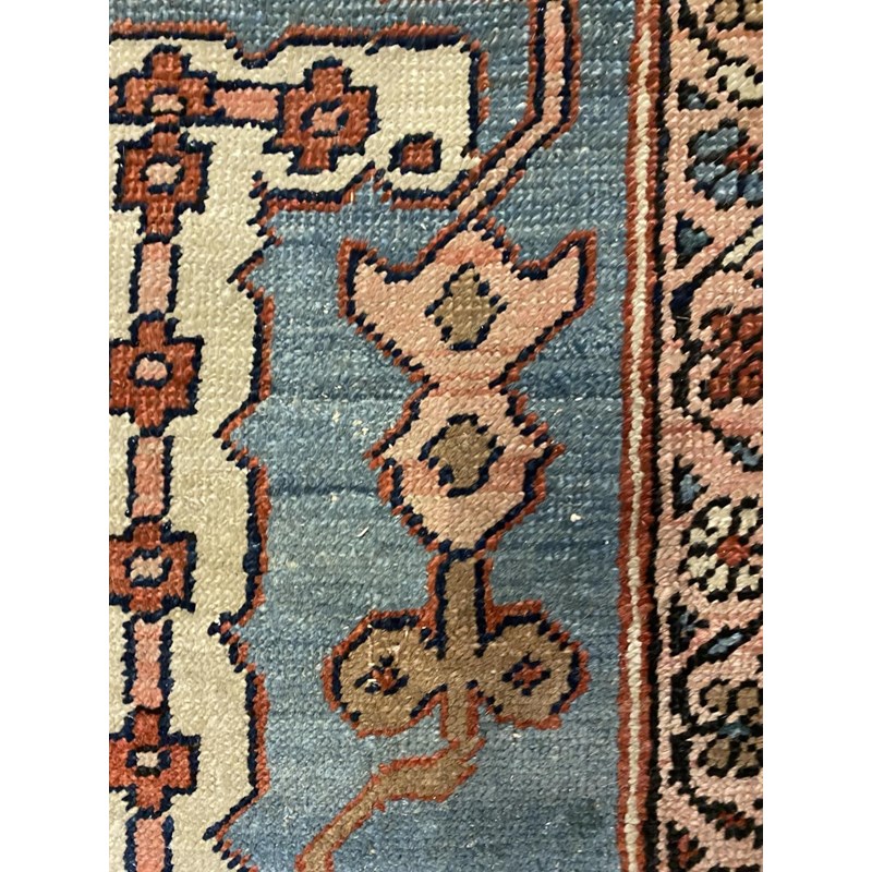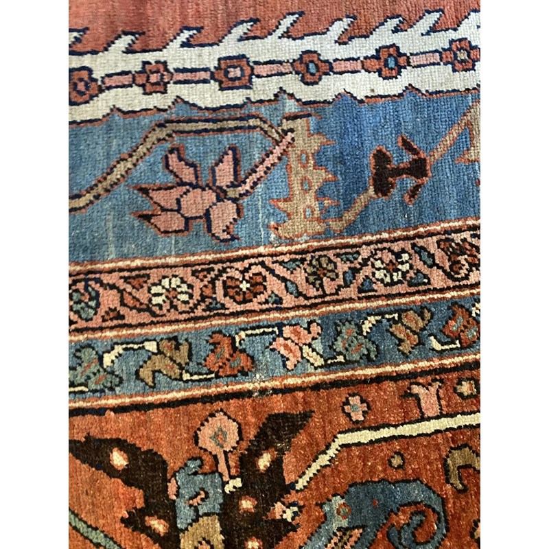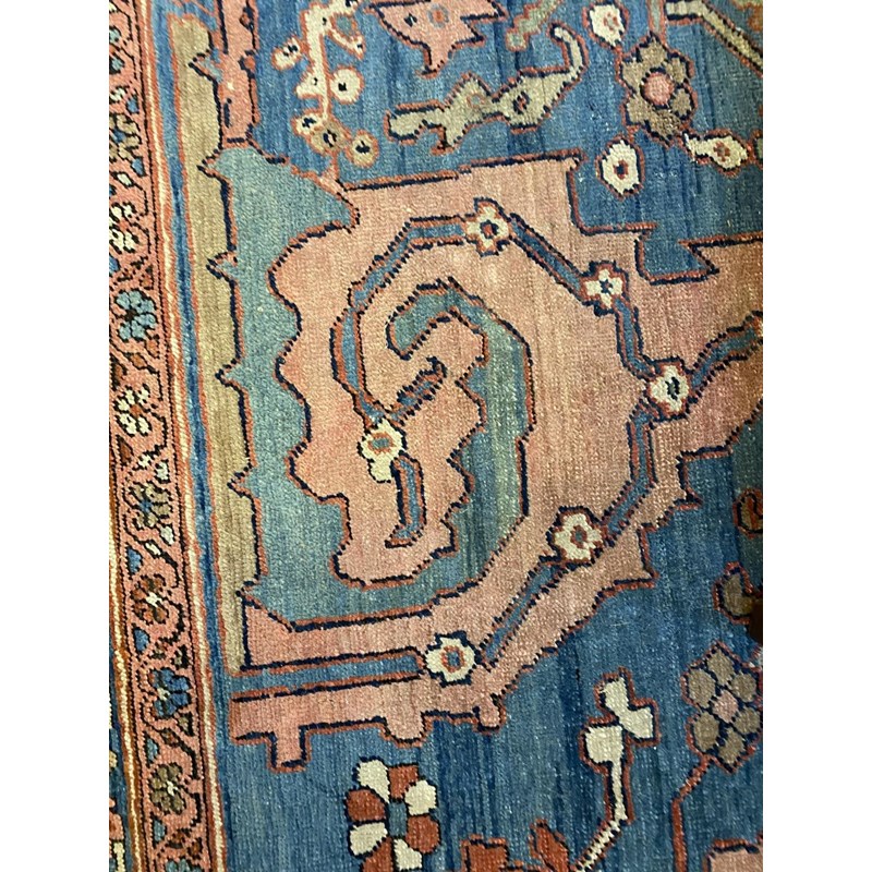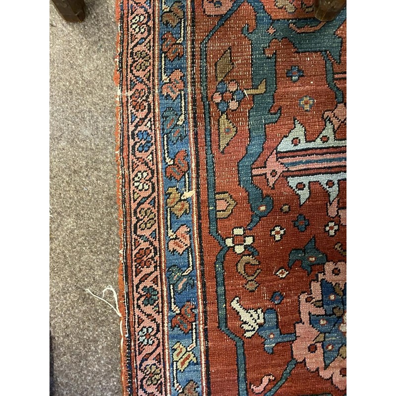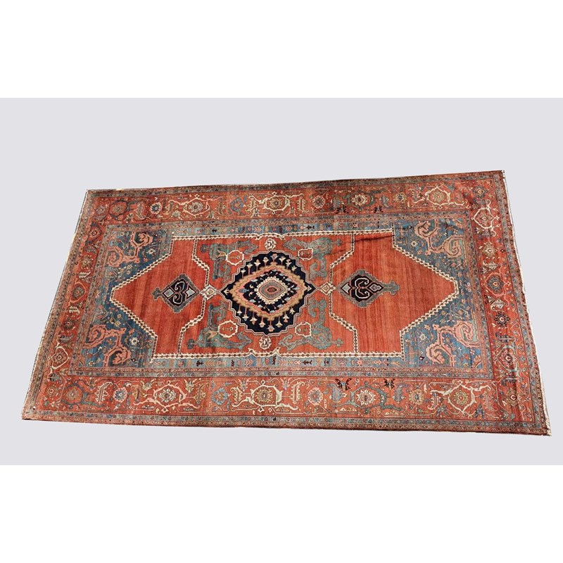 c1870. Iranian Azerbaijan, The abrashed terracotta field centred by a salmon pink and indigo medallion framed by ice blue spandrels and terracotta borders of stylised plants and angular vines flanked by carnation outer guard stripes. 642cm x 336cm