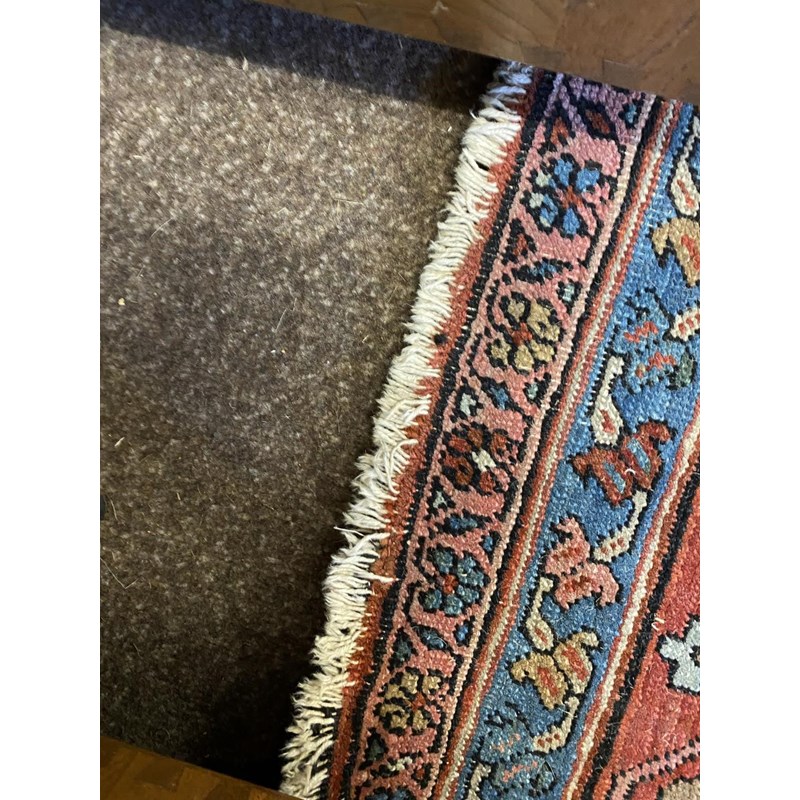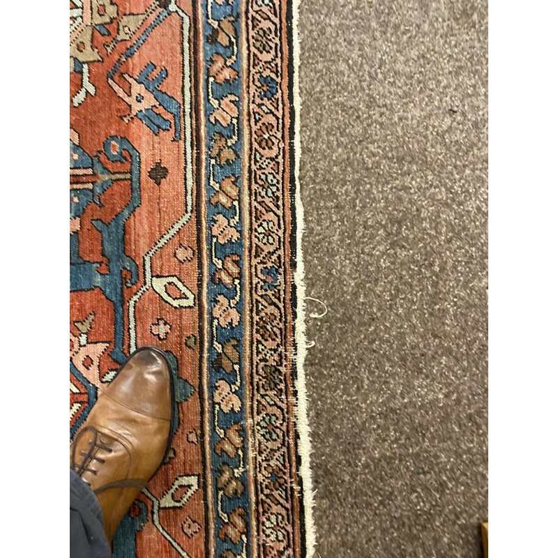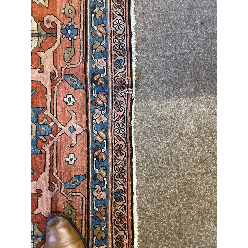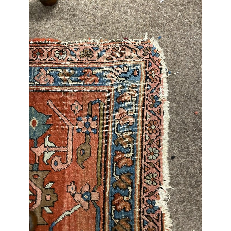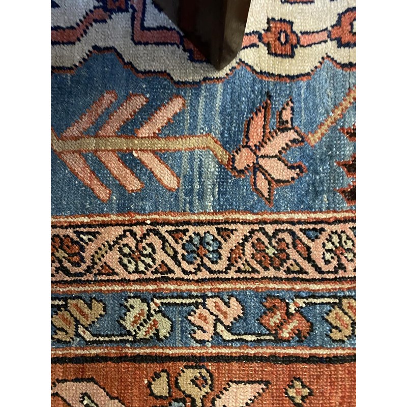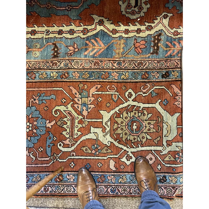 c1870. Iranian Azerbaijan, The abrashed terracotta field centred by a salmon pink and indigo medallion framed by ice blue spandrels and terracotta borders of stylised plants and angular vines flanked by carnation outer guard stripes. 642cm x 336cm
