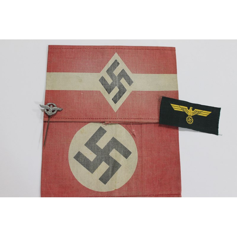 GERMAN ARMBANDS. Two German Armbands with faded red backgrounds, one with a Swaztika the other with a 'Hitler Jugend' style Swaztika.