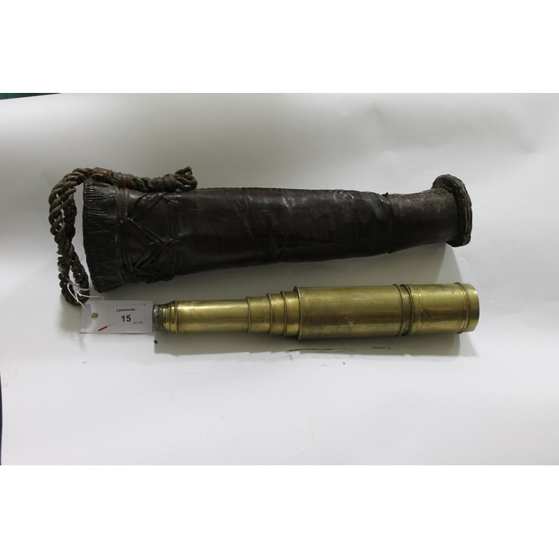 A BRASS TELESCOPE. A brass four-drawer telescope of some age, with cracked lens. No apparent makers mark, 24" overall length. The eyepiece has an old soldered repair evident.