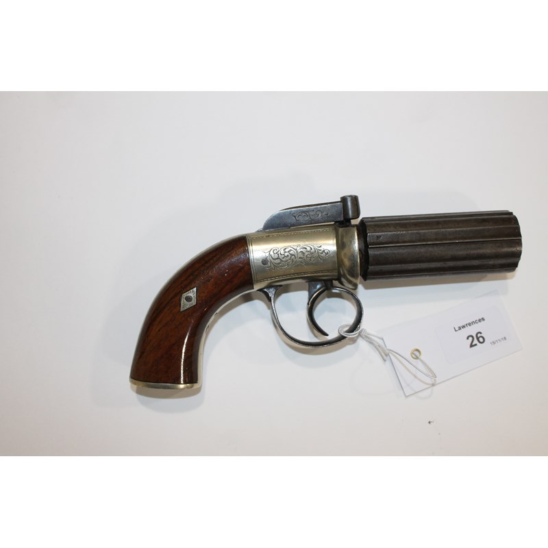 A six-shot pepperbox revolver with steel barrel of 3.1/8" in length. The nickel plated frame having some engraving, also to the oval buttplate. In good working order with walnut grips, overall length of 8.1/4".