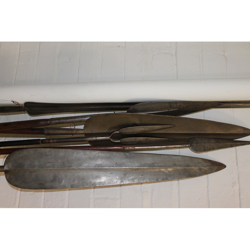 AFRICAN SPEARS. Including a Masai spear of 84.1/2" length. A dual point hunting spear of 64.1/2" length. A hunting spear of 73.3/4" in length. Broad bladed spears of 70.1/2" x 2 and another of 73" length.