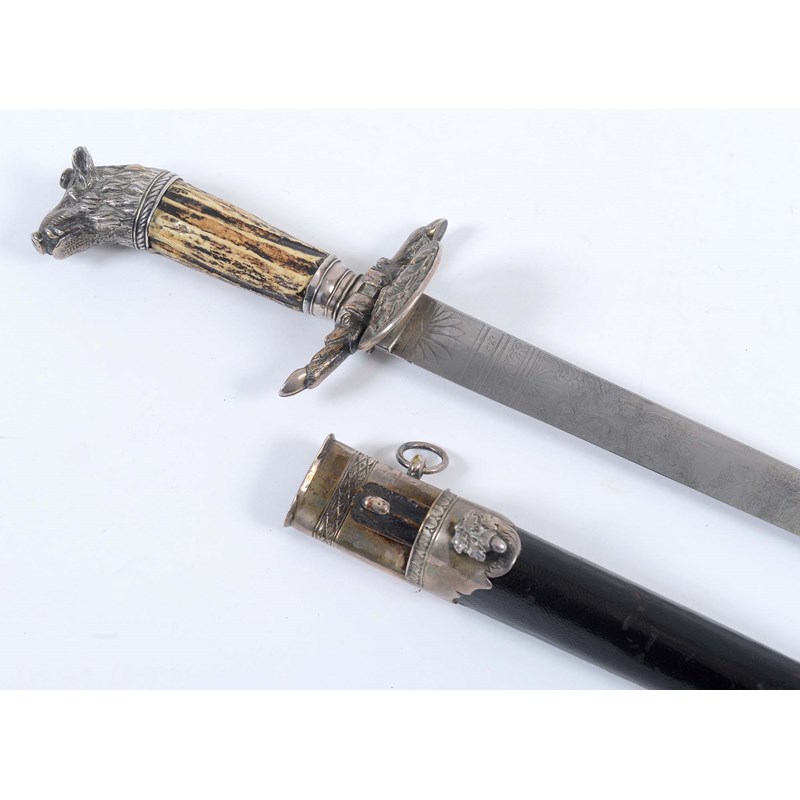 A German Hunting Sidearm by Ferd Fidel of Berlin. Of high quality with a staghorn grip and nickel-silvered mounts. The pommel of a Boars head, and guard of reversed hooves and seated stag and hind. The ornately decorated 21.1/4" blade having hunting scenes and crossed rifles and foiliage. Nickel silver decorated scabbard and mounts, with black leather and inset skinning knife. The 4" bladed knife, decorated with hunting scenes, etc.