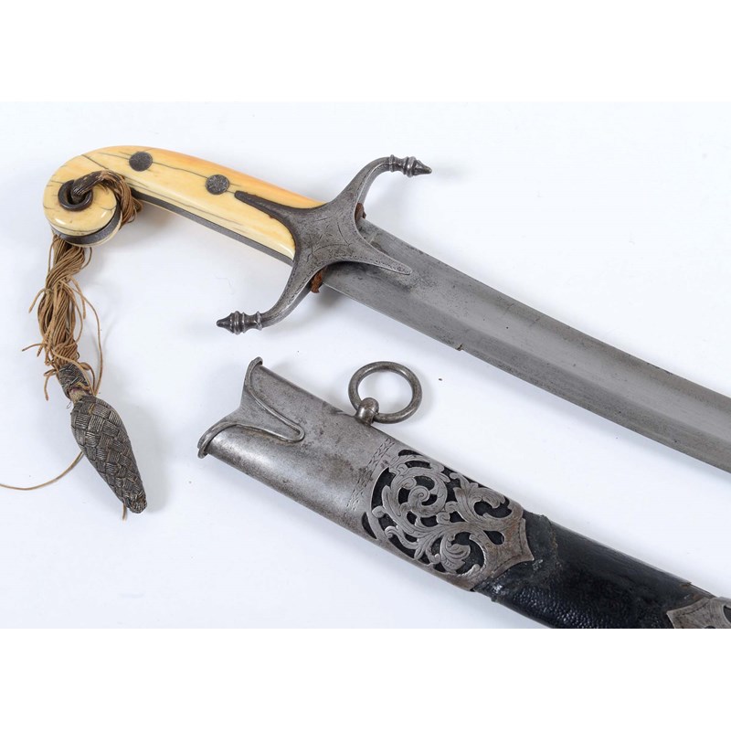 Having ivory grips and steel mounts, steel and black leather mounted scabbard. The reversed quillions crossguard, with light engraving evident. Single-edged curved blade with three-quarter broad fuller, 31.1/4" length with Garden on the spine. Pierced design steel mounts to the scabbard, of decorative form. C1800.