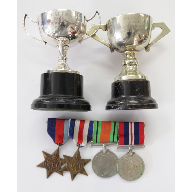 A 1939/45 Star also a France & Germany Star, together with Defence & War Medals. Privately engraved to Pte A L Cole 10 Para. Plated Boxing Trophies dated 1943 & 1944, engraved to A L Cole.