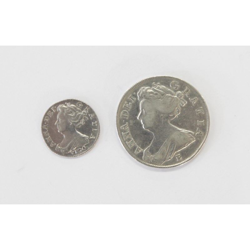 QUEEN ANNE COINAGE. A 1707 dated Halfcrown piece and Sexto in the edge lettering. Also a 1703 dated Sixpenny piece.