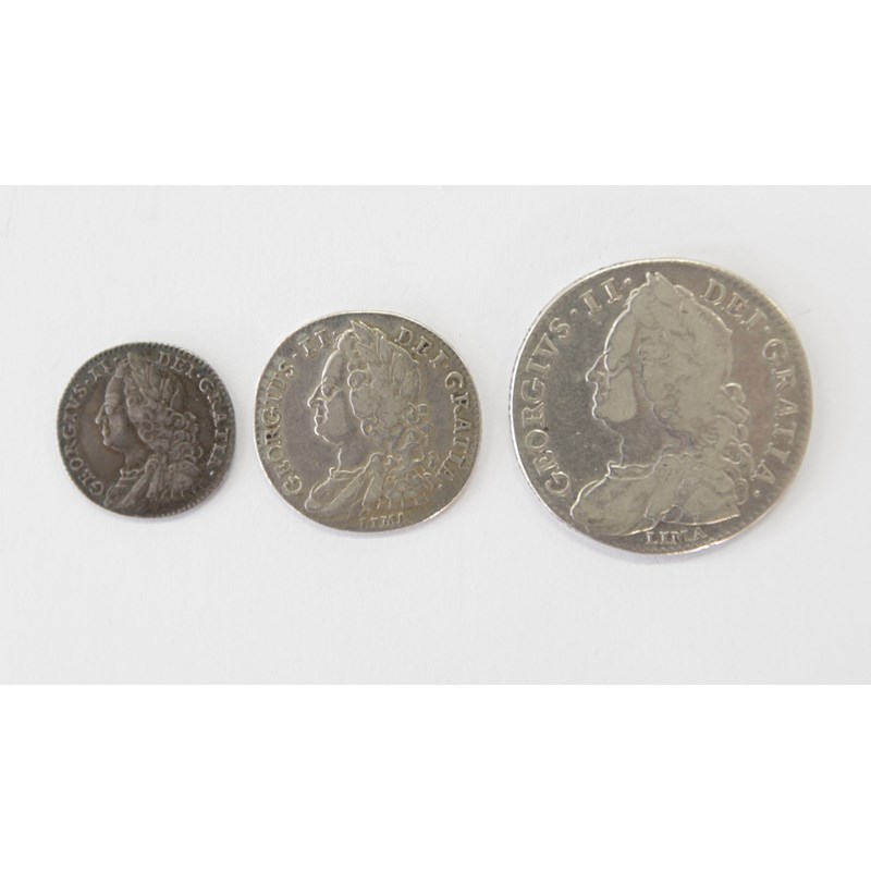 GEORGE 11 COINAGE. Including a Halfcrown piece dated 1746 with Decimo in the edge lettering. A Shilling piece dated 1745 and a Sixpenny piece dated 1758. (3)
