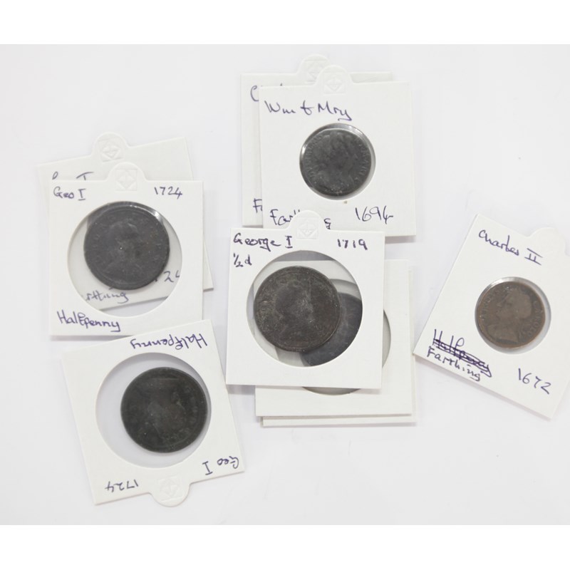 Including Charles 11 Farthings dated 1672 and 1674. William et Maria Farthing dated 1694, a William 111 Farthing dated 1697. George 1 Halfpennies including a Dump Issue dated 1717, 1719 & 1724 x 2, also a 1724 dated Farthing piece,