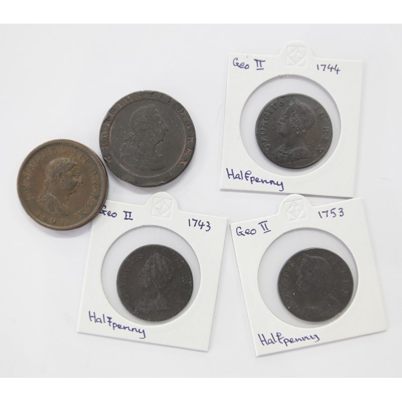 CARTWHEEL COINAGE etc. Including 1797 dated Twopenny piece x 2, also One Penny pieces of 1797 x 2. An 1806 dated Soho One Penny piece, Halfpennies of 1743-1744 and 1753.