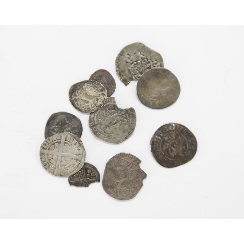 1. A Longcross Penny of Henry 111 Canterbury Mint. 2. A drilled Loncross Penny of Henry 111. 3. An unidentified Longcross Half Penny with amulets by the crown. 4. A Henry 11 Penny. 5. An unidentified Half Penny with saltires by the neck, etc.