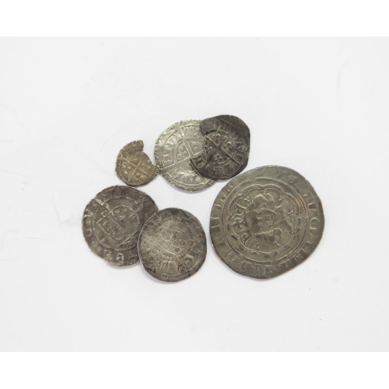 Including a Henry 111 Penny without Sceptre. A Partial Edward 111 Half Penny with London mint mark (Cross). An unidentified Quarter Penny, also a Henry V11 Halfgroat (Canterbury 2nd issue) x 2. An Edward 111 Groat London mint, pre treaty type.